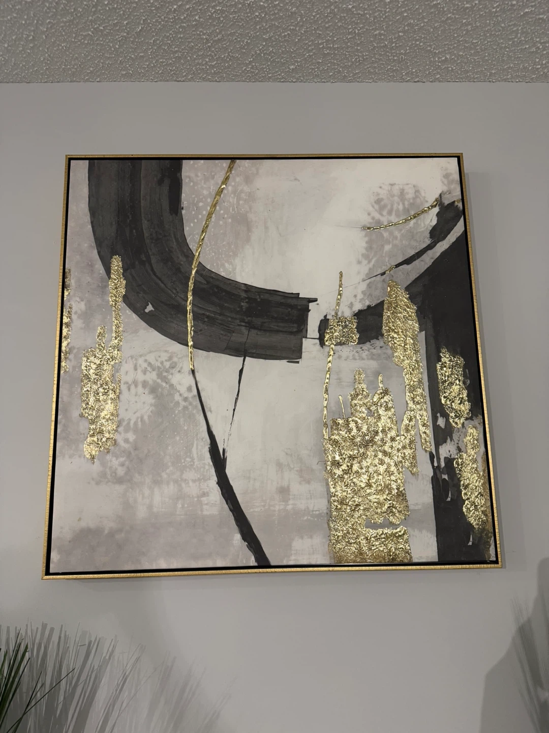 This abstract canvas wall art features a striking design with bold black strokes and shimmering gold accents. It's framed with a sleek gold border, making it a great statement piece for any room. Ready to hang and add a touch of modern elegance to your space!