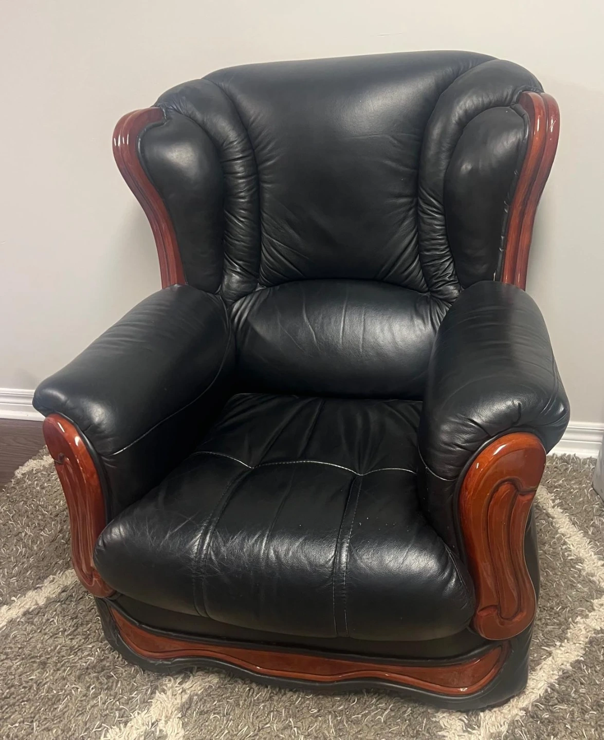 Comfortable black leather armchair. It features plush seating and elegant wooden trim on the arms and base.