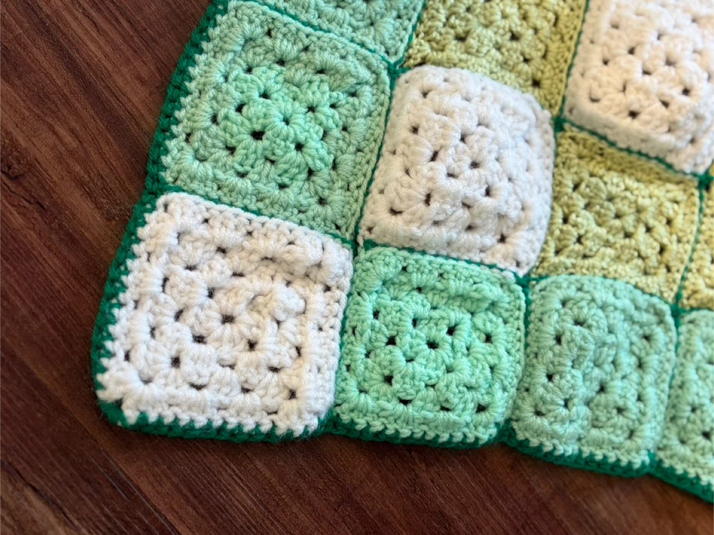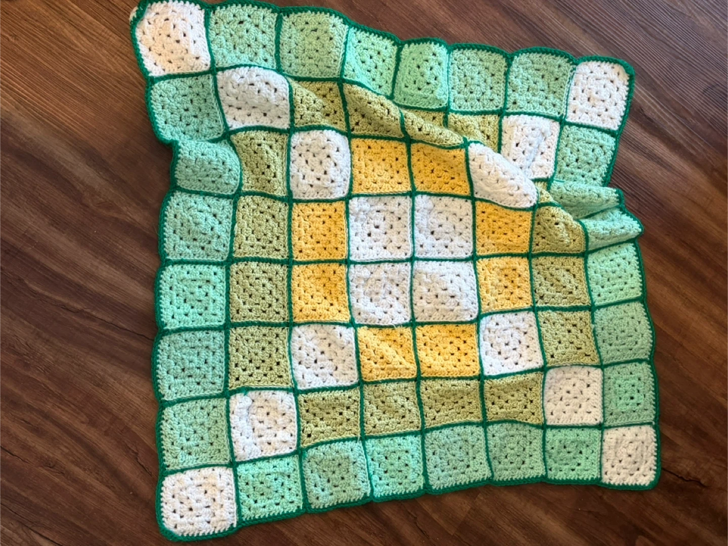 This is a charming, handmade crochet blanket made with granny squares. It features a lovely mix of green, white, and yellow yarn, with a dark green border. The open weave design makes it lightweight and airy. It's perfect for a nursery or as a decorative throw!