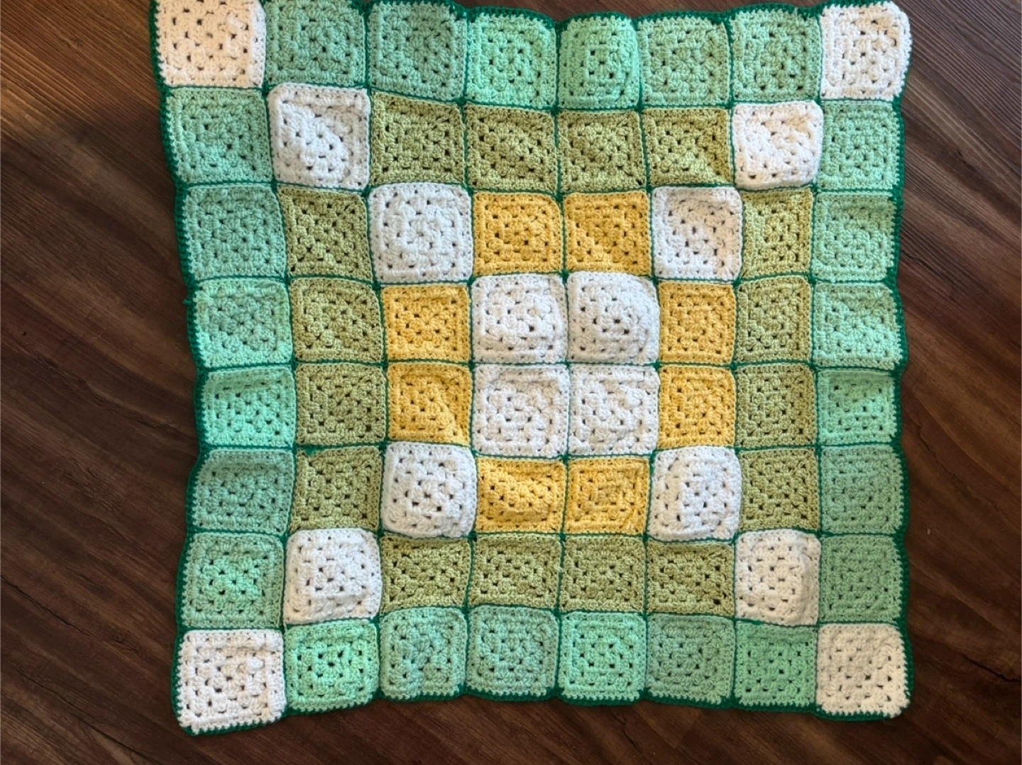 This is a charming, handmade crochet blanket made with granny squares. It features a lovely mix of green, white, and yellow yarn, with a dark green border. The open weave design makes it lightweight and airy. It's perfect for a nursery or as a decorative throw!