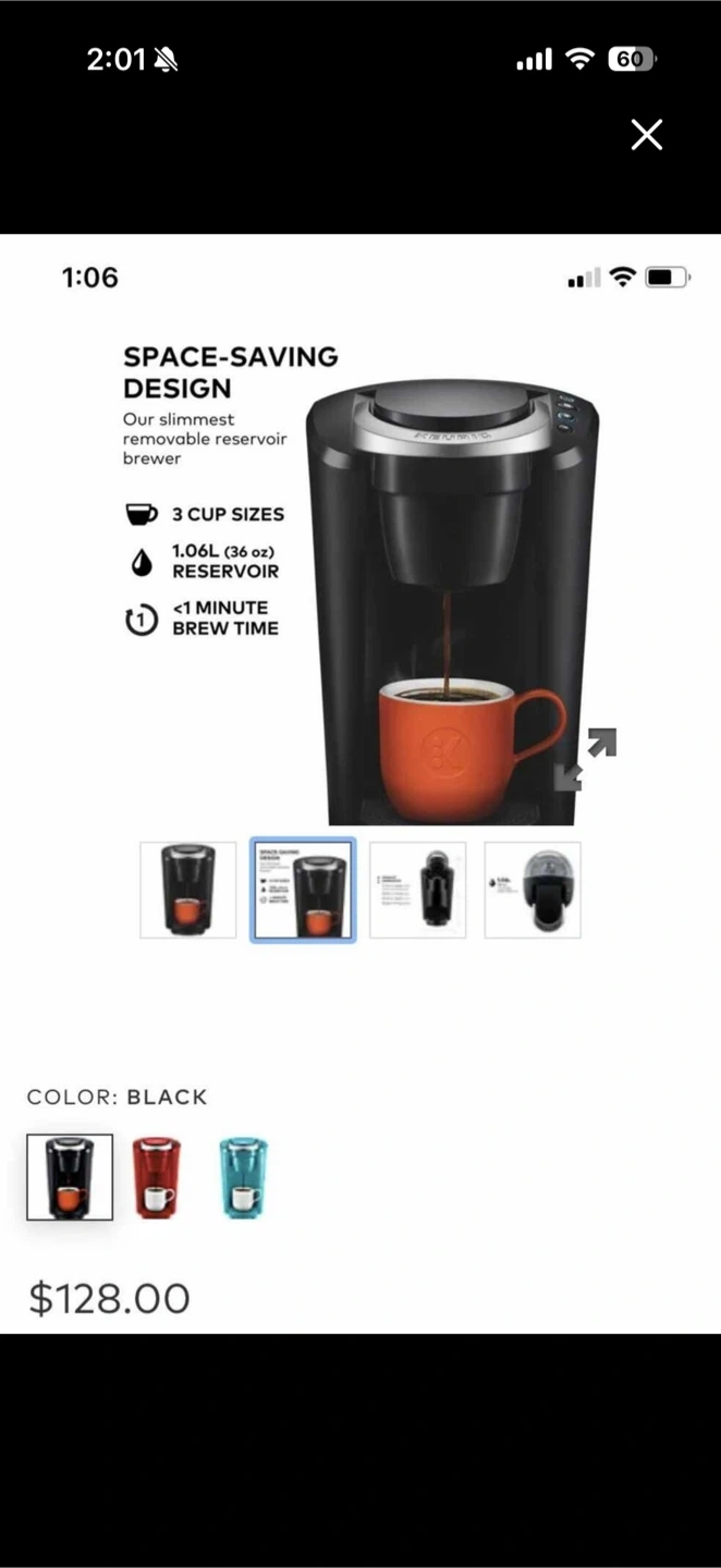 This Keurig K-Compact coffee maker brews up to three cup sizes. It features a 1.06L removable reservoir and a space-saving design. Brew time is under one minute!
