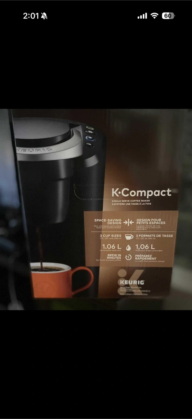 This Keurig K-Compact coffee maker brews up to three cup sizes. It features a 1.06L removable reservoir and a space-saving design. Brew time is under one minute!