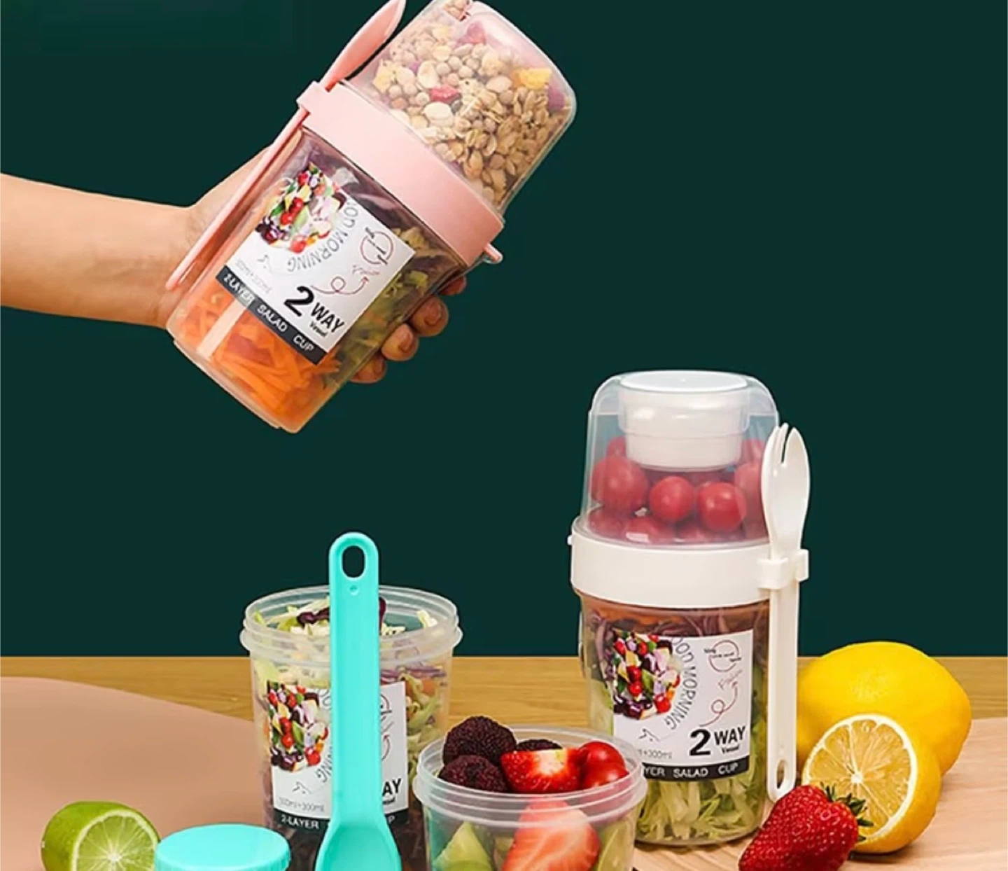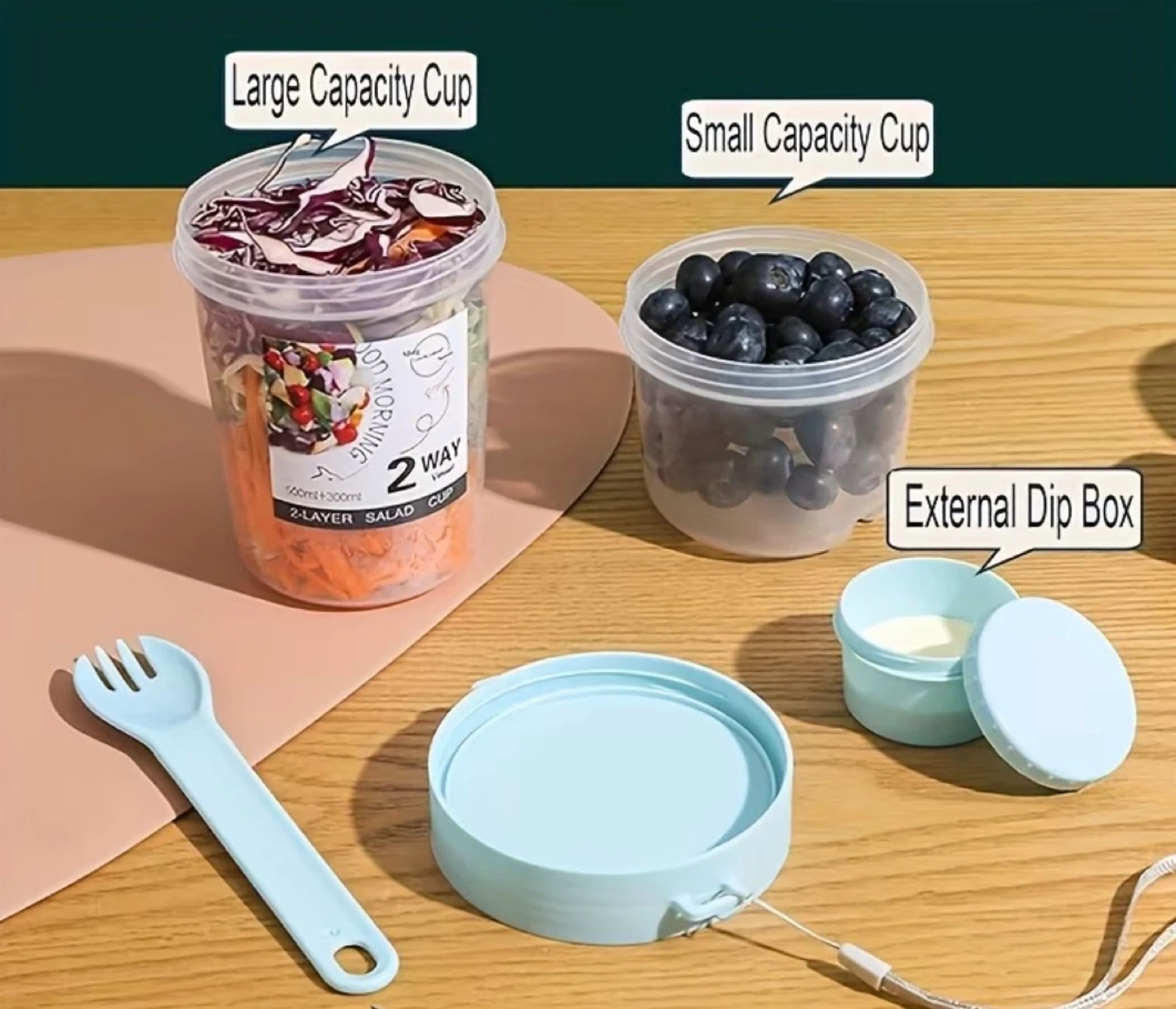 2-Layer Salad Cup with Utensils and Dip Box