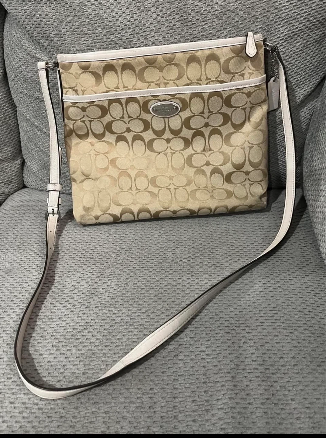 This is a classic Coach crossbody bag with the signature "C" monogram pattern. It features a zip-top closure and an adjustable strap for comfortable wear. The interior has multiple pockets to help you stay organized.