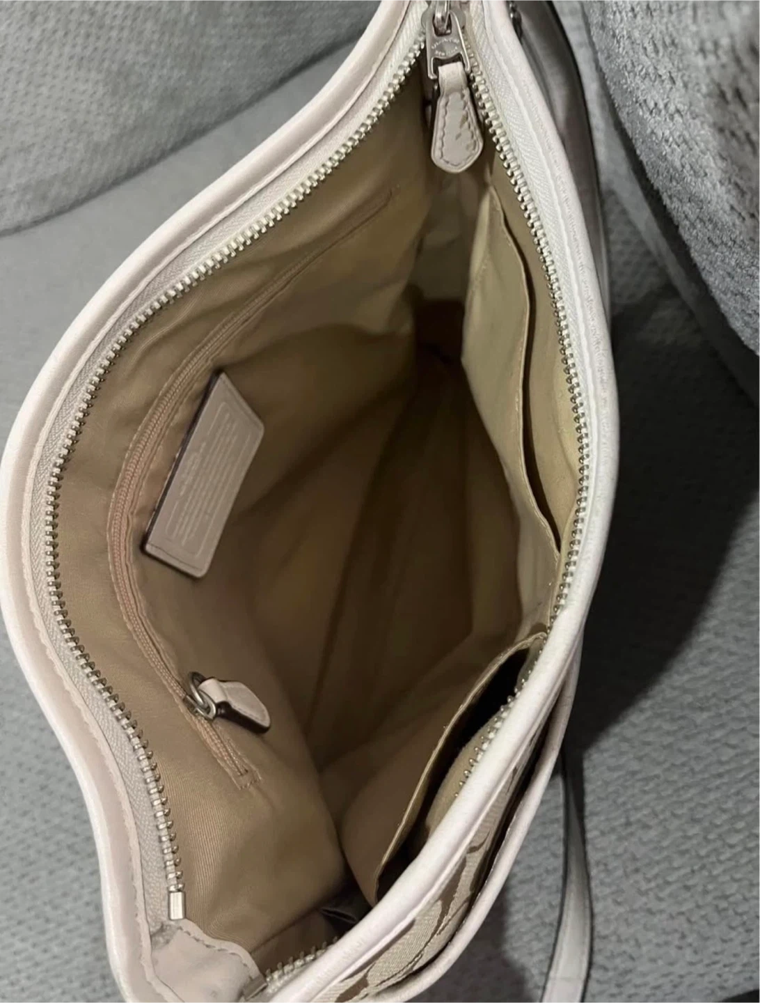 This is a classic Coach crossbody bag with the signature "C" monogram pattern. It features a zip-top closure and an adjustable strap for comfortable wear. The interior has multiple pockets to help you stay organized.