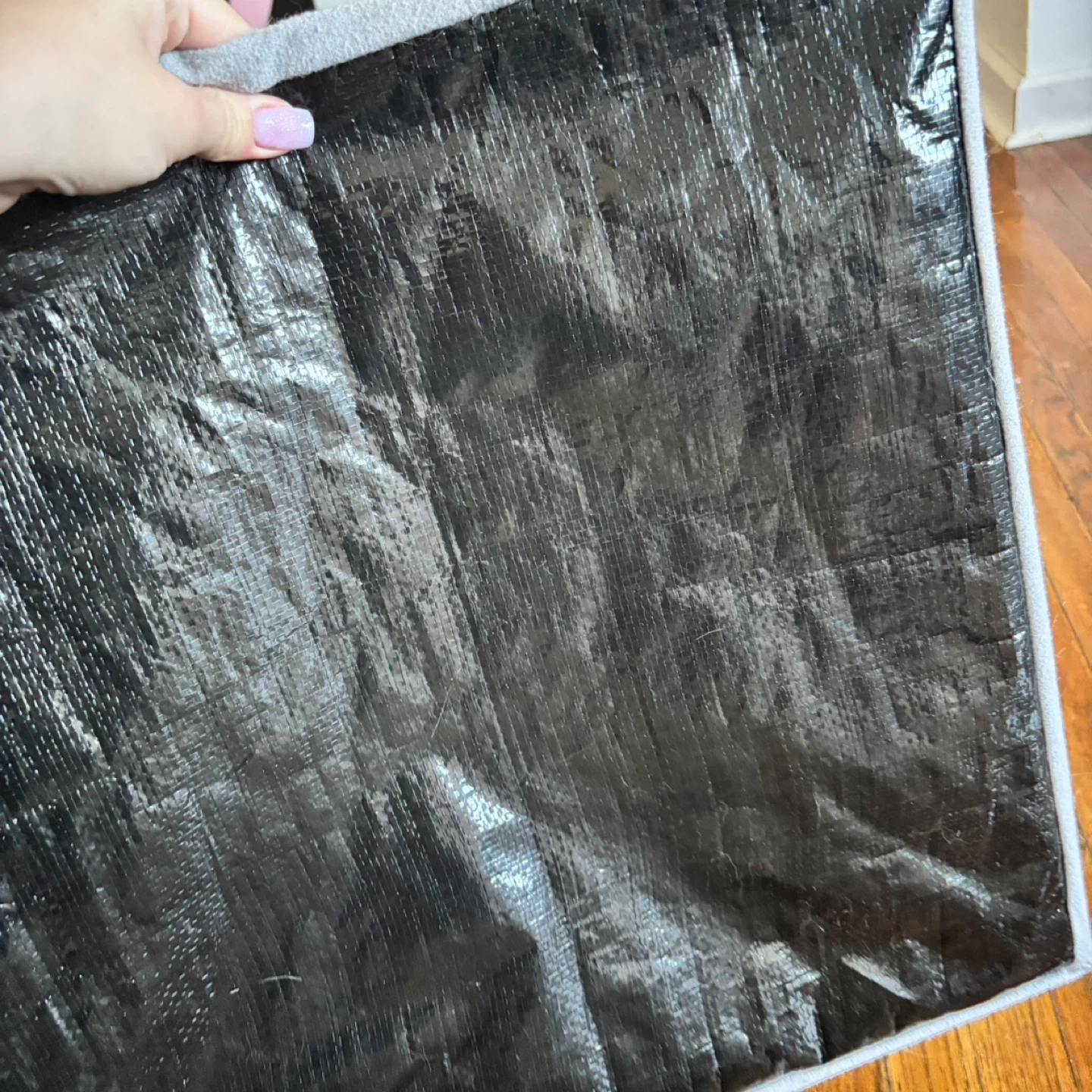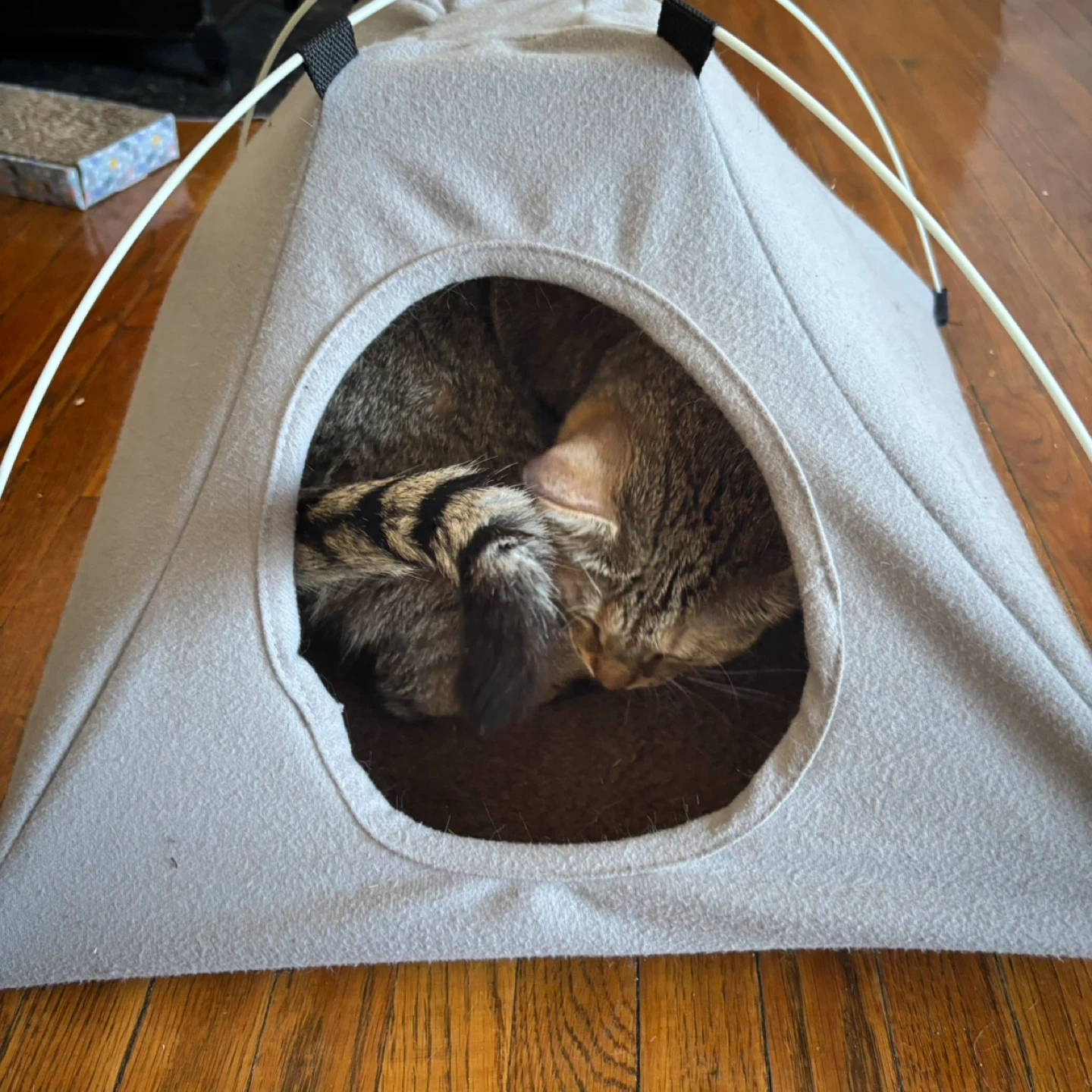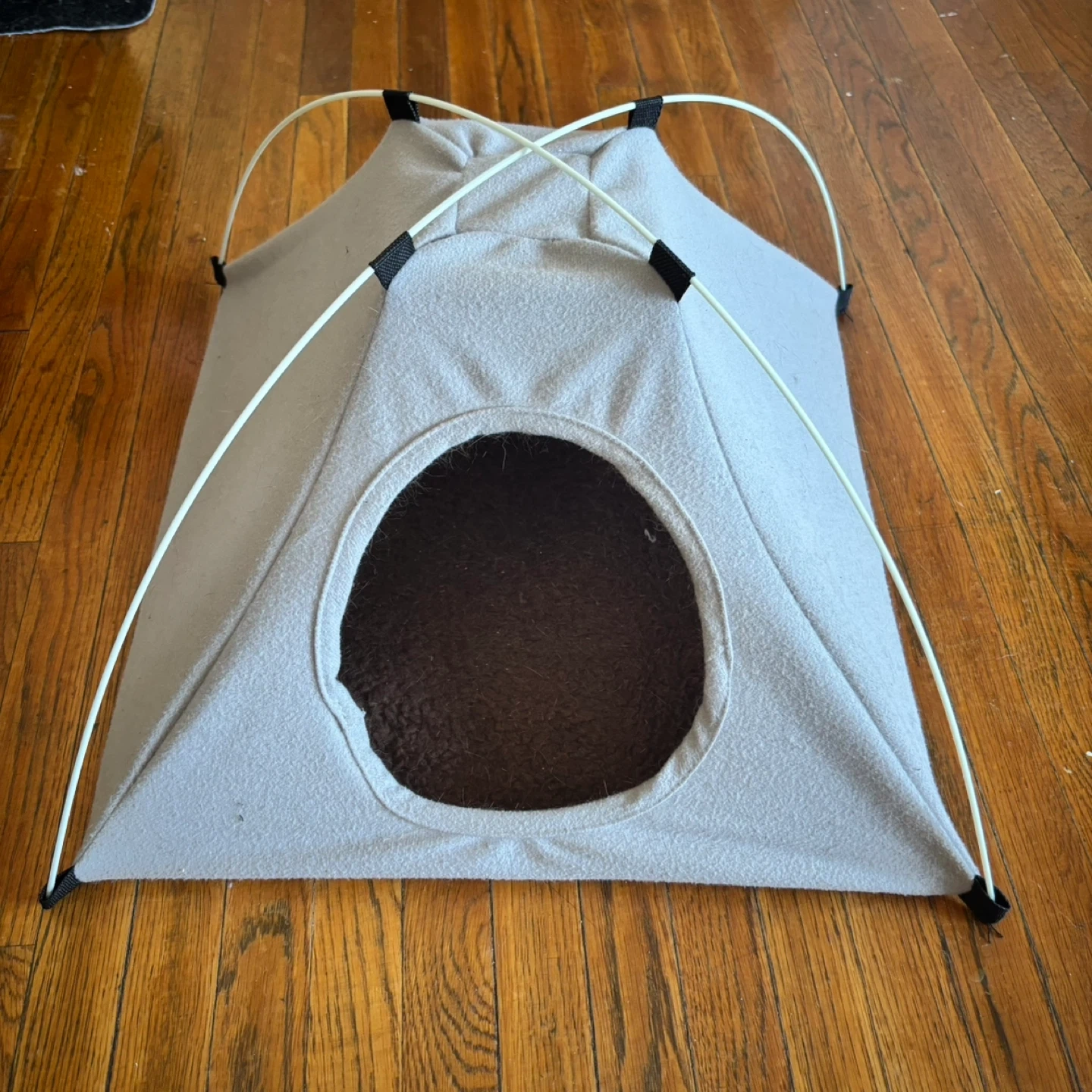 Cozy grey pet tent bed for cats or small dogs. It's made with soft felt material and has a durable, waterproof bottom. Your pet will love this comfy den!