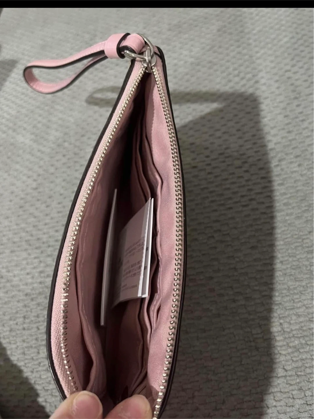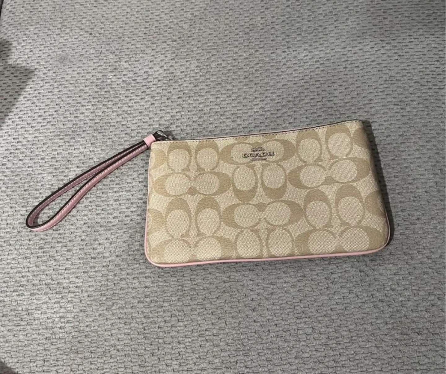 This is a Coach wristlet featuring the signature C logo pattern in tan and a pink trim. It has multiple card slots inside. Great for carrying essentials!
