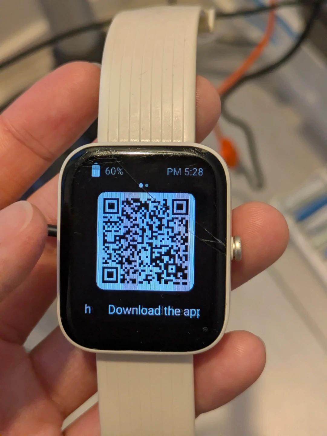 Amazfit Bip 3 Pro in beige. Still functional even though screen is cracked. And missing a strap holder - I've using it with elastic bands.