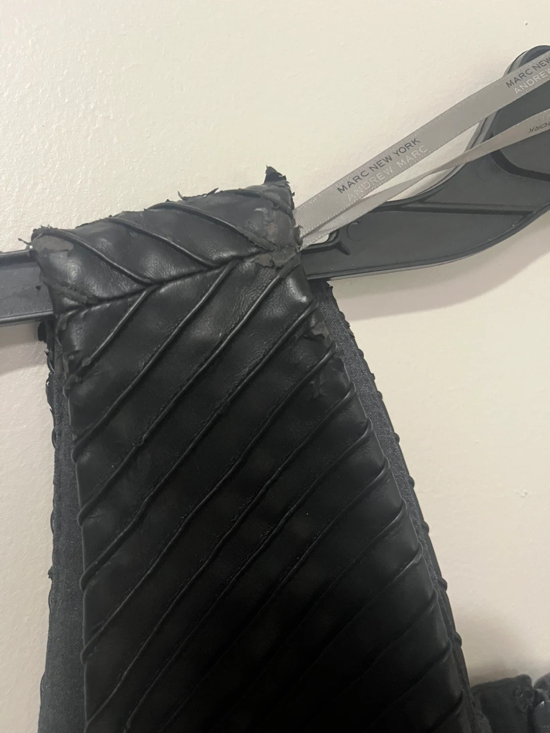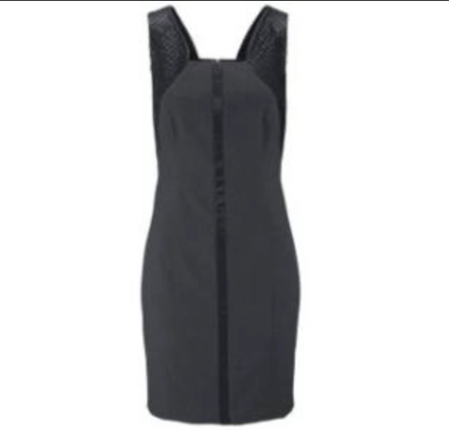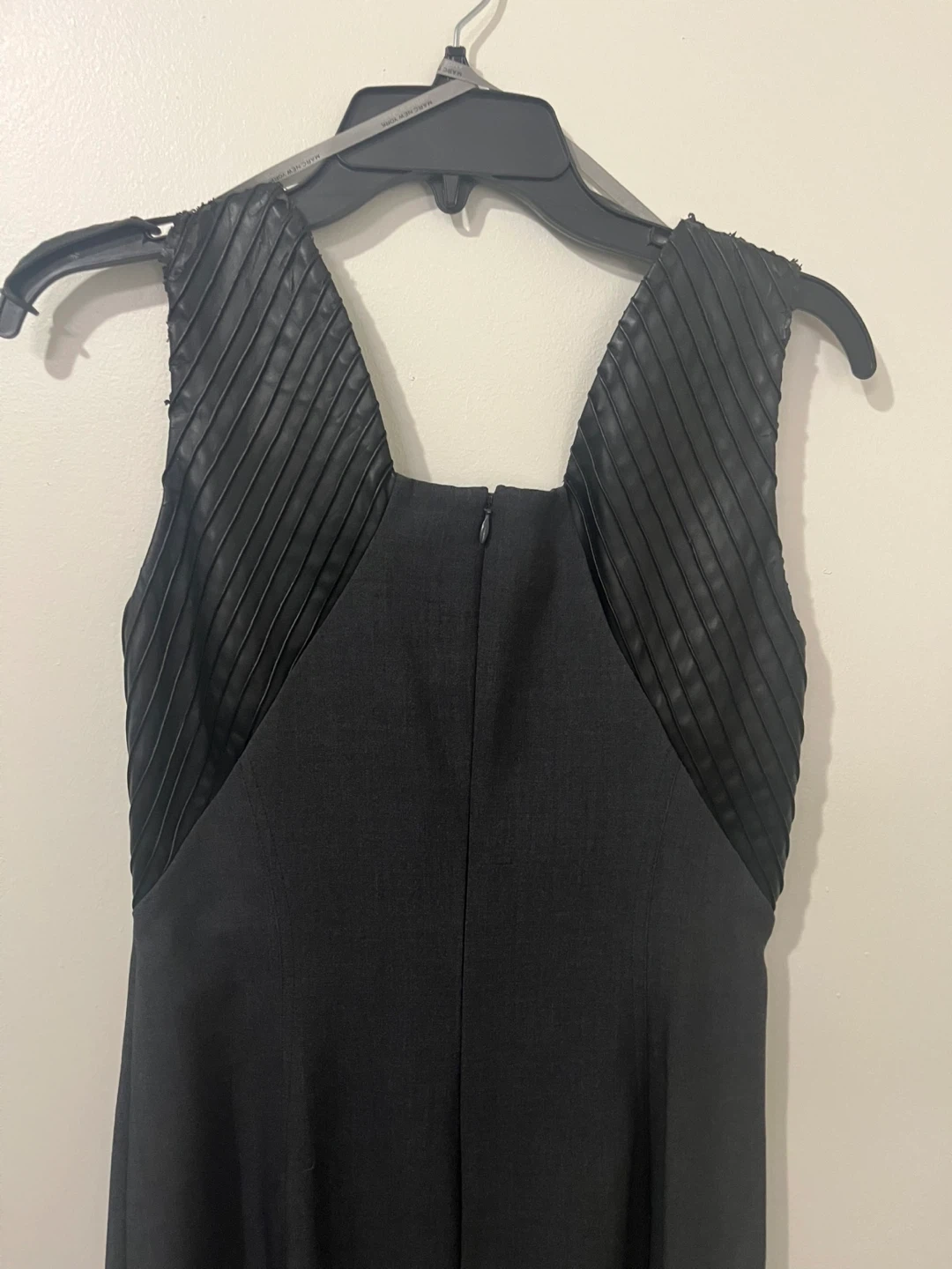 Sleeveless dress with faux leather detailing on the shoulders. Zipper closure at the back. It's a stylish piece for various occasions.