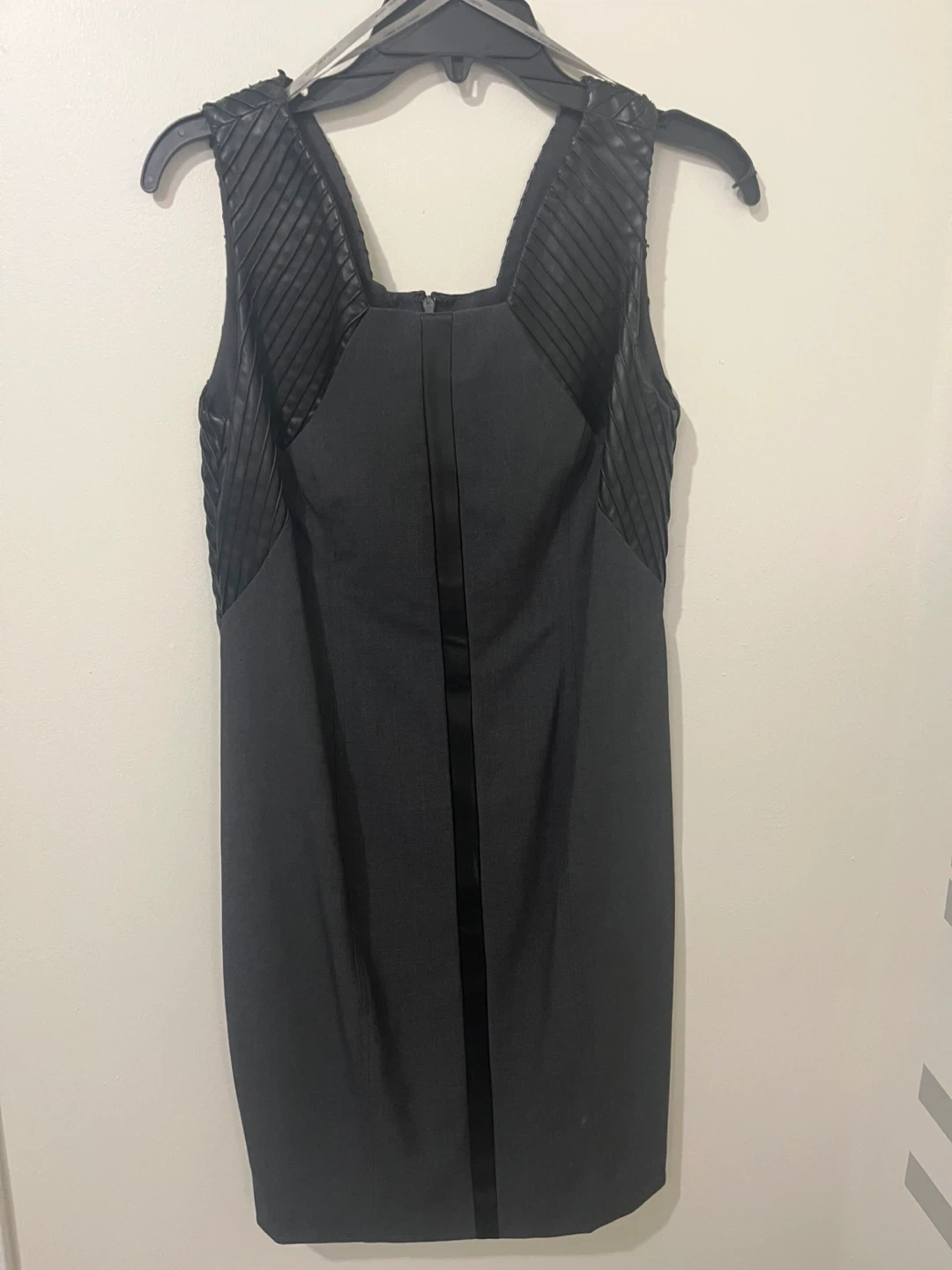 Sleeveless dress with faux leather detailing on the shoulders. Zipper closure at the back. It's a stylish piece for various occasions.