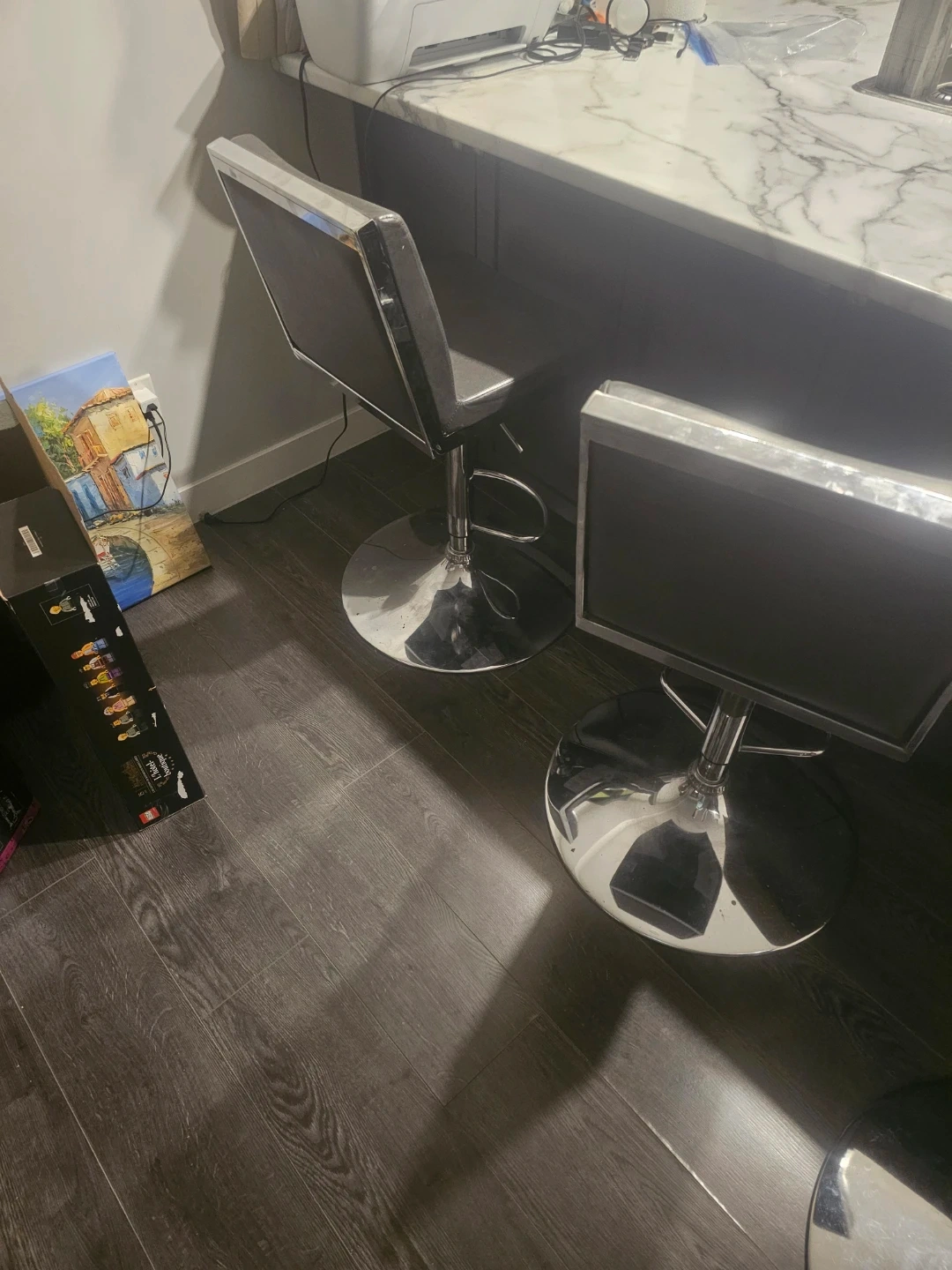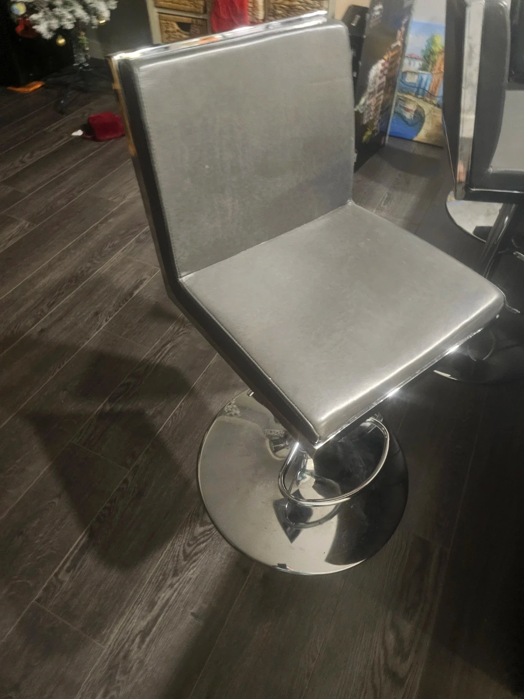 Three contemporary bar stools featuring grey faux leather seats and chrome accents. These stools are height-adjustable and swivel 360 degrees. They're built on a sturdy chrome base with a footrest. Great for a kitchen island or home bar!