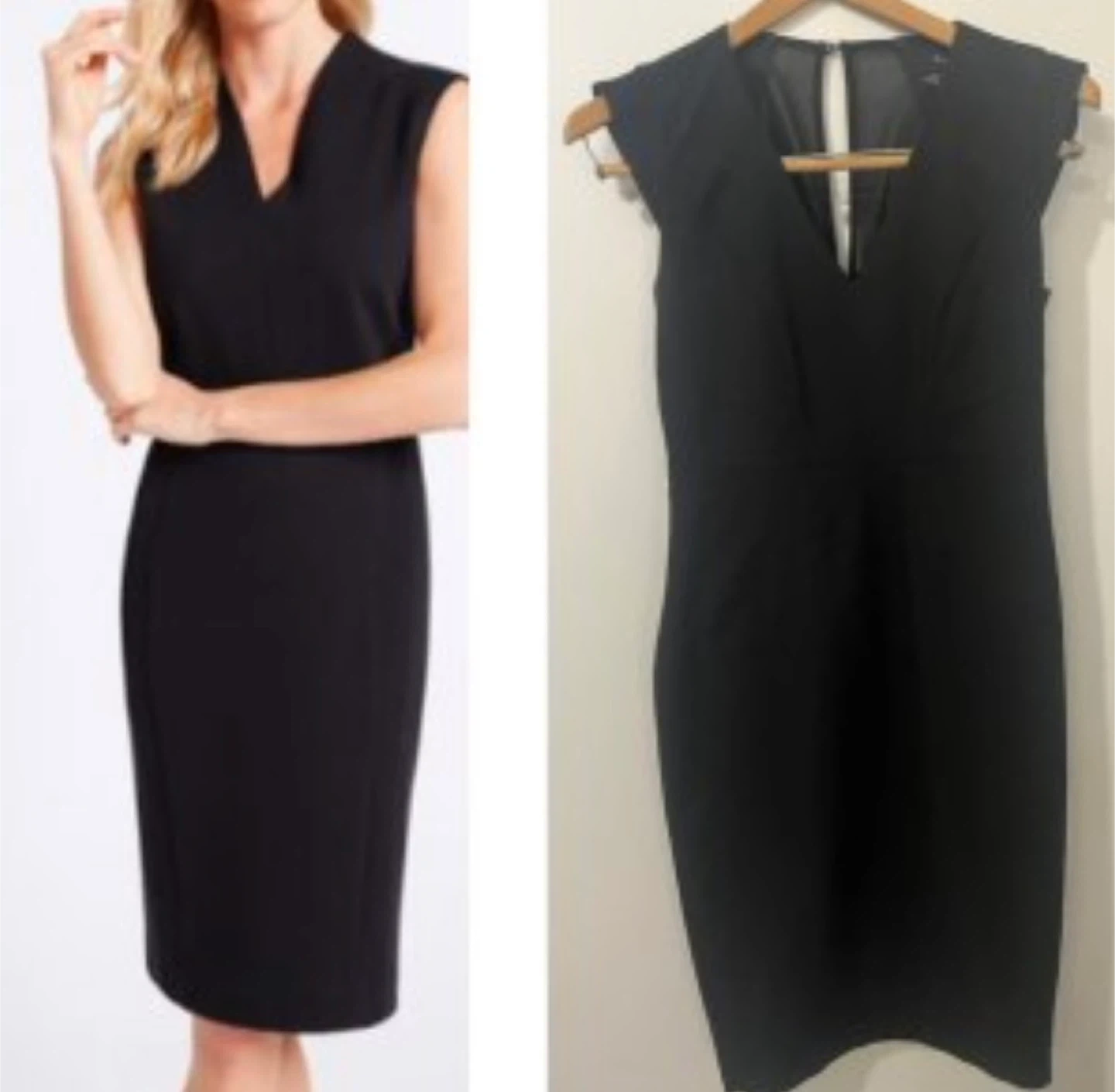 Classic black sheath dress with a sheer mesh insert at the back yoke. Sleeveless design with a V-neckline, slimline, stretchy tailoring.Zips up at the back. Great for business casual or evening wear!