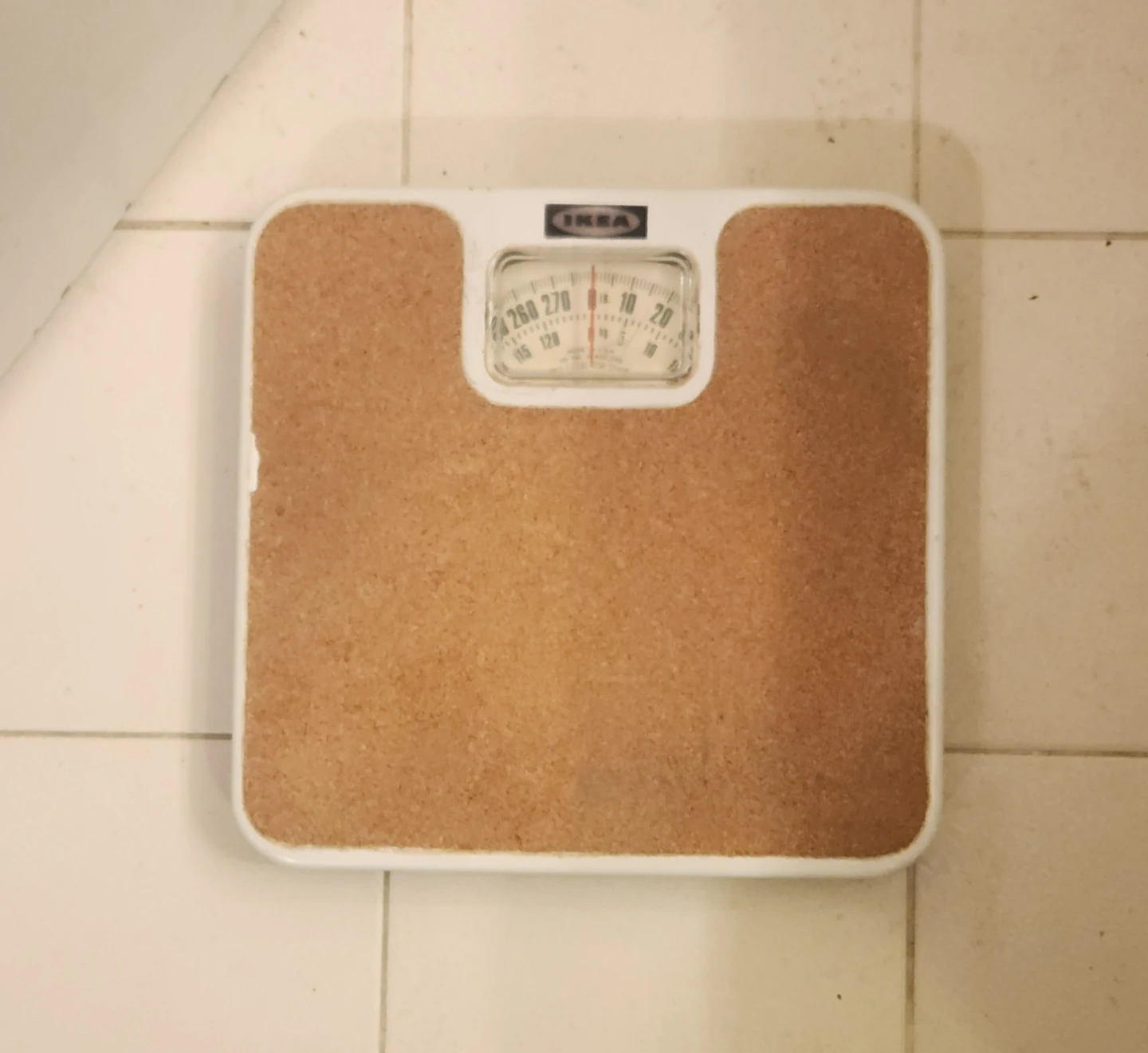 This is an IKEA mechanical bathroom scale with a cork-patterned top. It has a dial display for weight readings. It's a reliable way to track your weight.