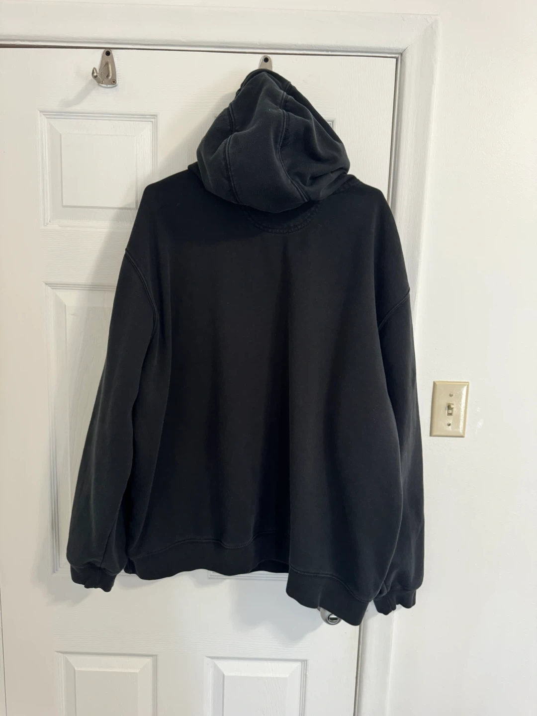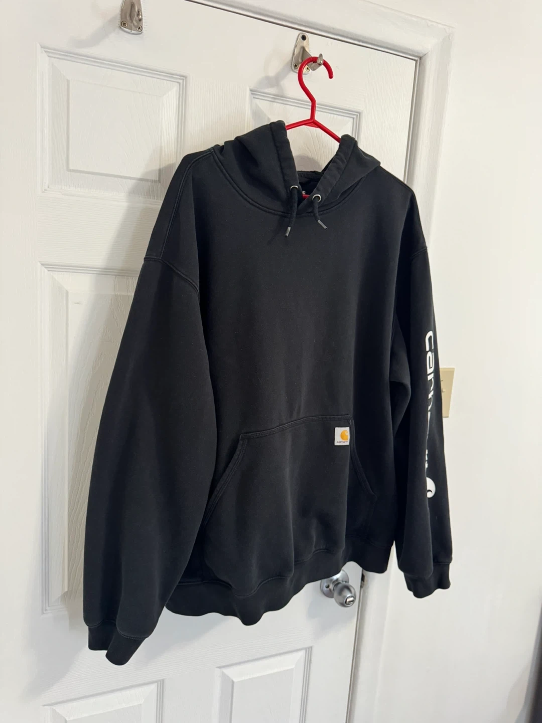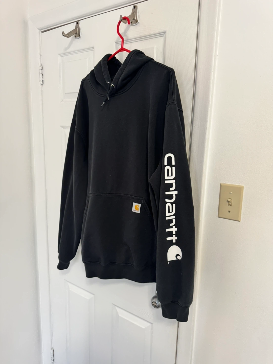This Carhartt hoodie is in a loose fit and size 2XL. It's black with "Carhartt" printed vertically on the sleeve. It's made in Vietnam. This hoodie is built to serve and protect all hardworking people.