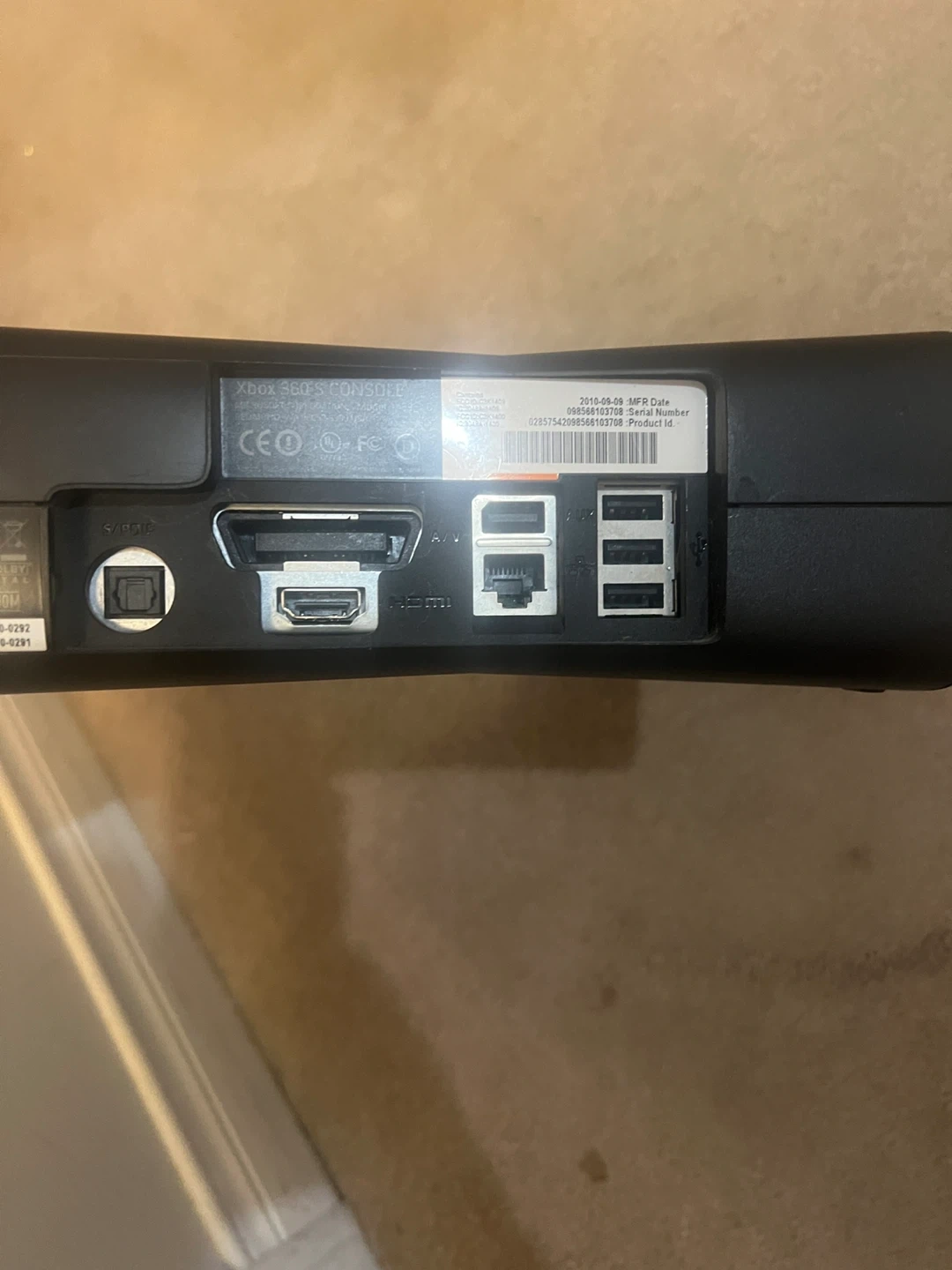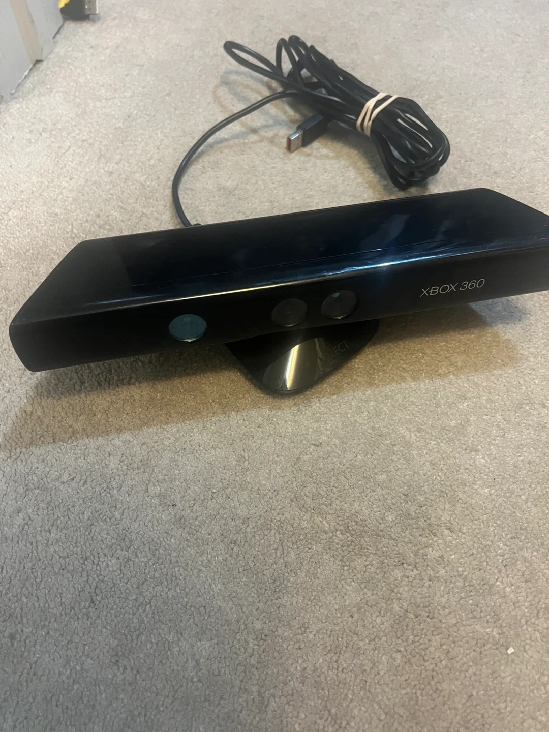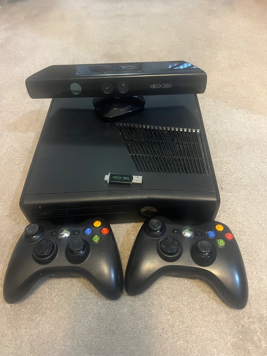 Xbox 360 S console with Kinect sensor and two black controllers. Includes an 8 GB SanDisk USB drive. Everything you need for gaming fun!