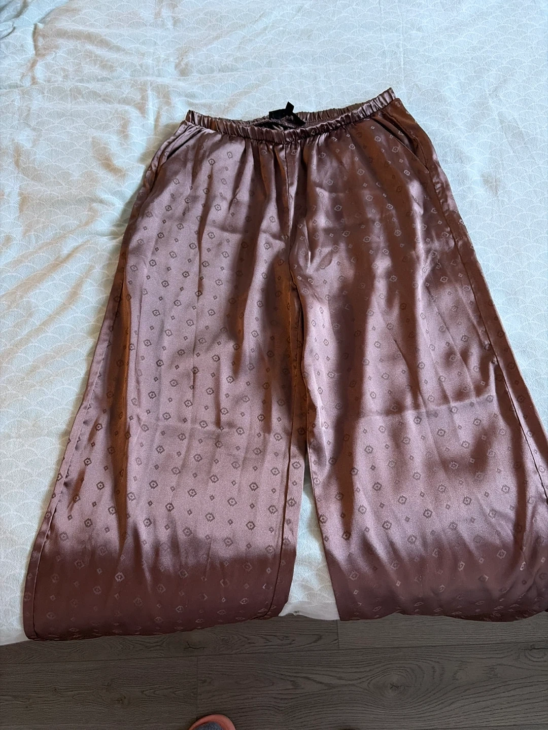 These silky wide-leg pajama pants feature a subtle all-over geometric pattern. They have an elastic waistband for comfort and a flowy silhouette. Satin material.