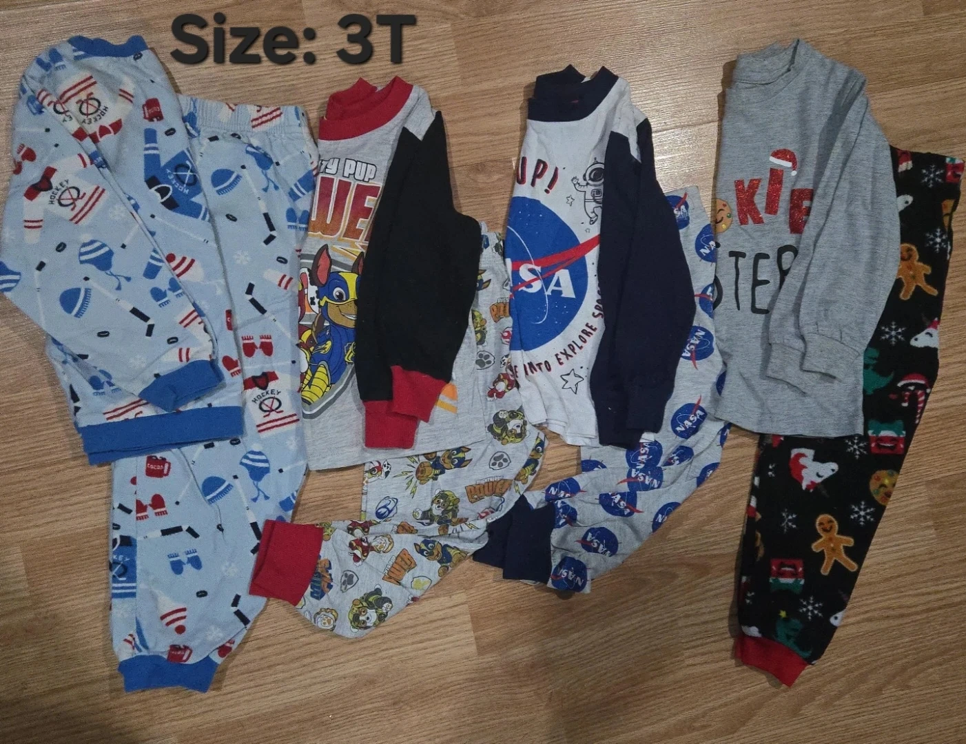 Four pairs of kids' pajamas. Includes designs with Paw Patrol, NASA, and holiday themes. Size 3T.
