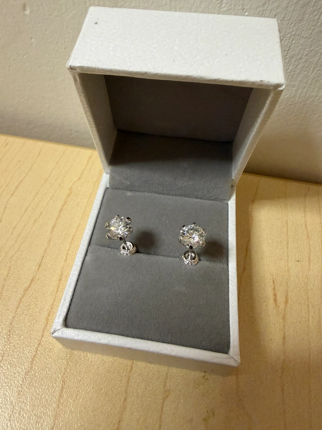 These are GRA certified Moissanite stud earrings. They come with a certificate of authenticity and a jewelry cleaning cloth. The earrings are set in a classic six-prong setting.