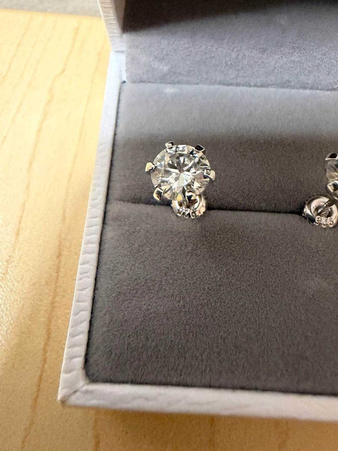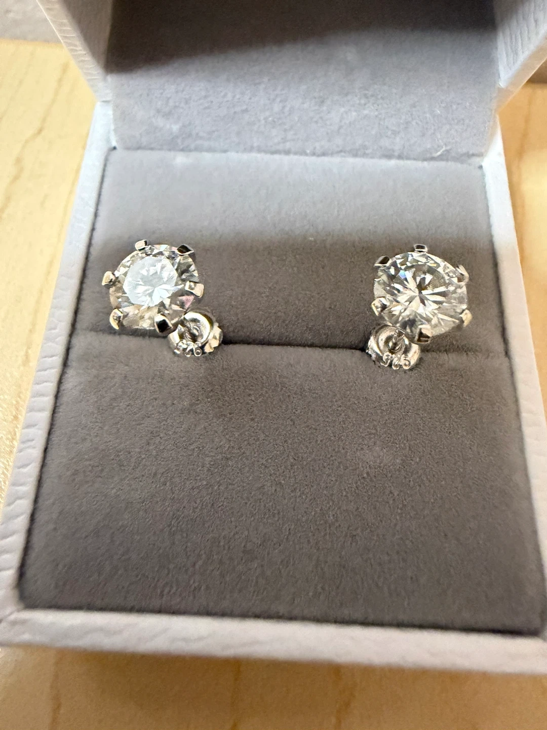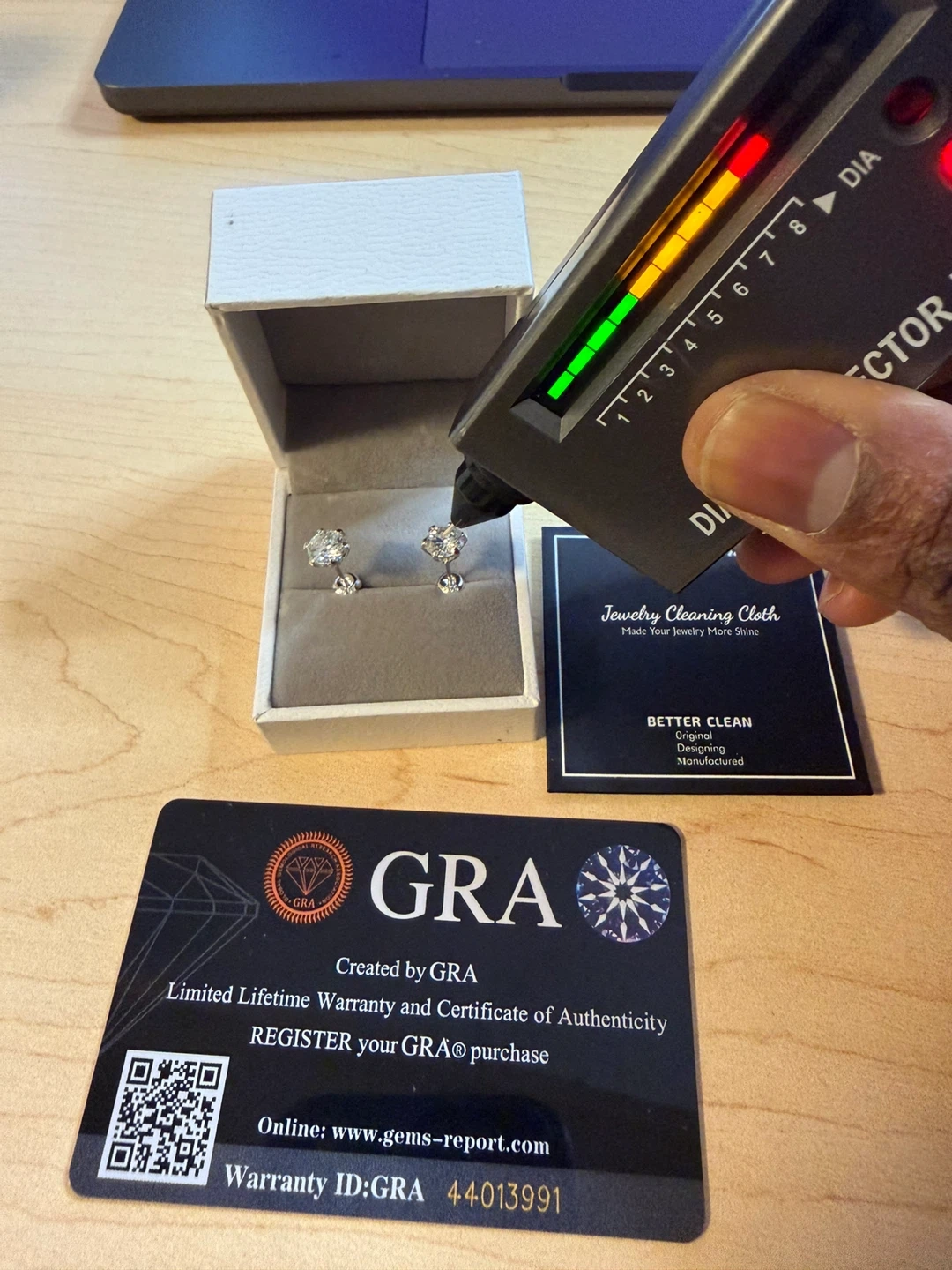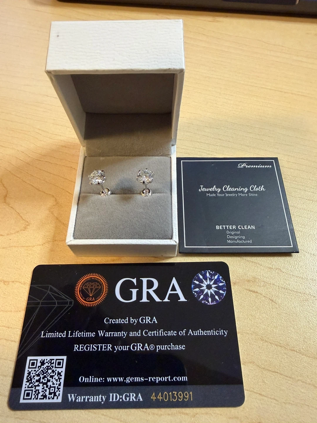 These are GRA certified Moissanite stud earrings. They come with a certificate of authenticity and a jewelry cleaning cloth. The earrings are set in a classic six-prong setting.