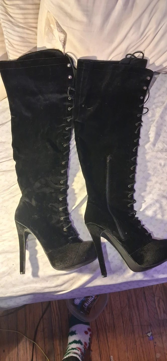 Women's black velvet thigh-high boots with lace-up front and side zipper. Features a pointed toe and a high stiletto heel with a platform sole. These boots are stylish and striking!