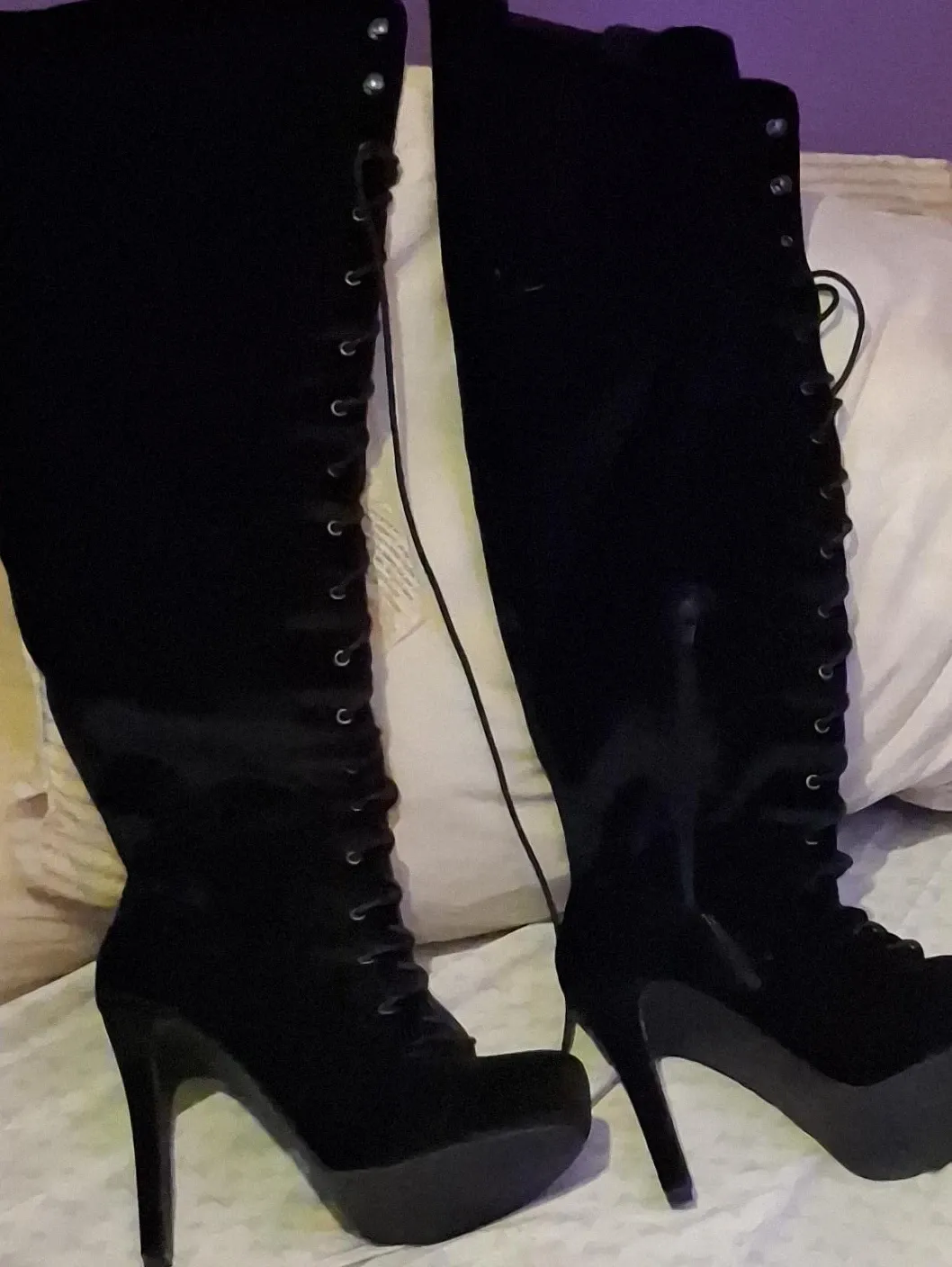 Women's black velvet thigh-high boots with lace-up front and side zipper. Features a pointed toe and a high stiletto heel with a platform sole. These boots are stylish and striking!