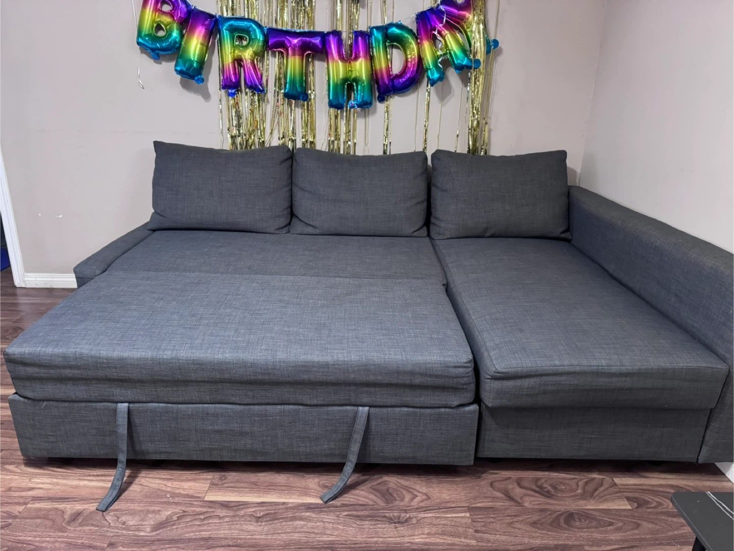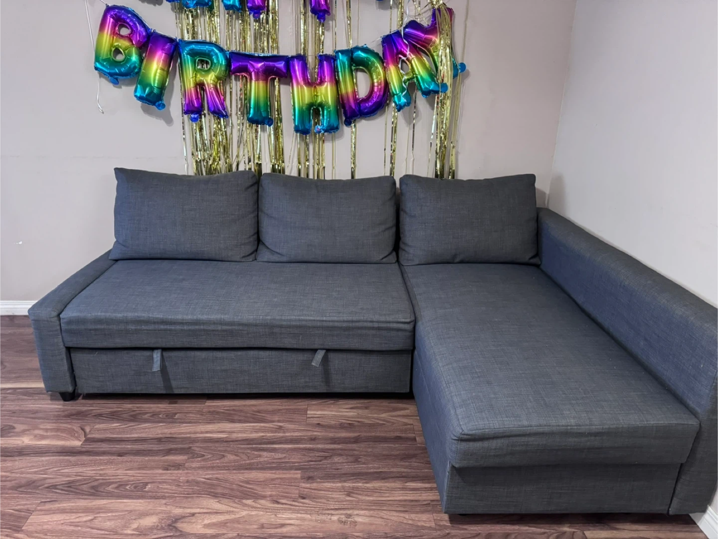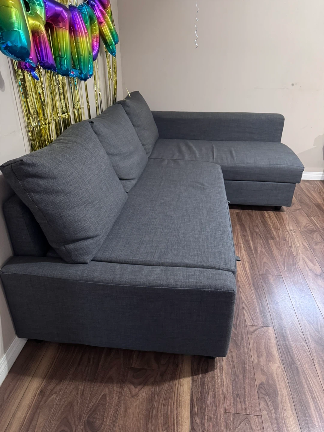 This sectional sofa bed is upholstered in a dark grey fabric. It features a pull-out bed mechanism and a storage chaise. Great for small spaces!