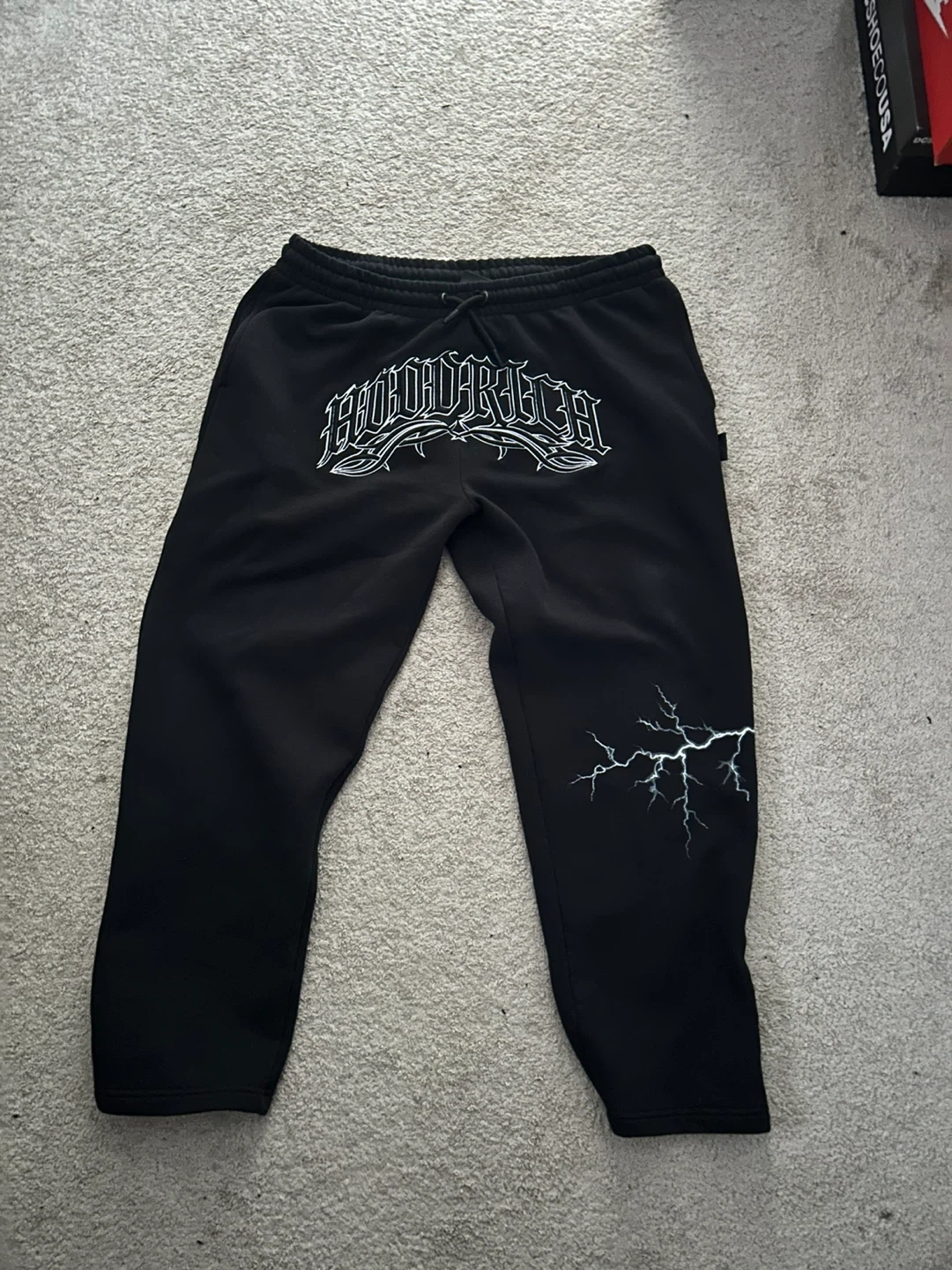 Black hoodrich sweatpants with a lightning bolt on the right leg. These pants feature a drawstring waist for a comfortable fit.