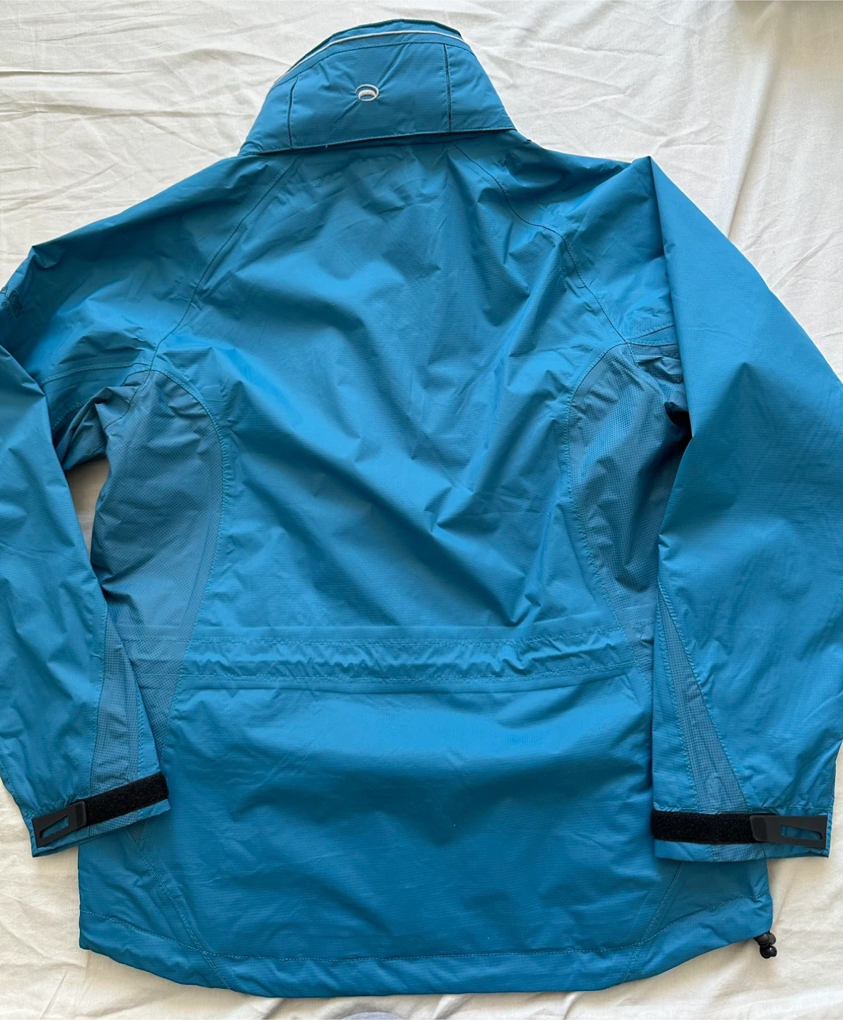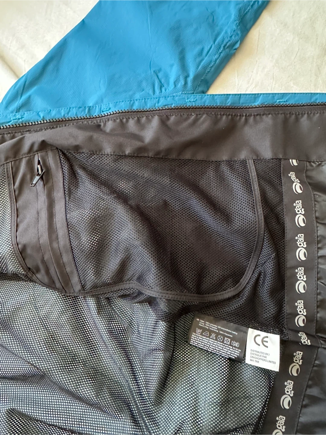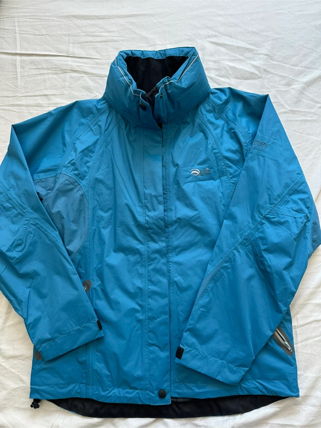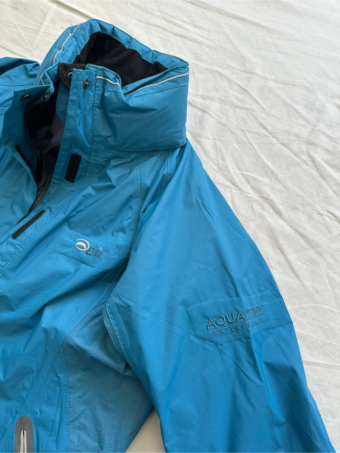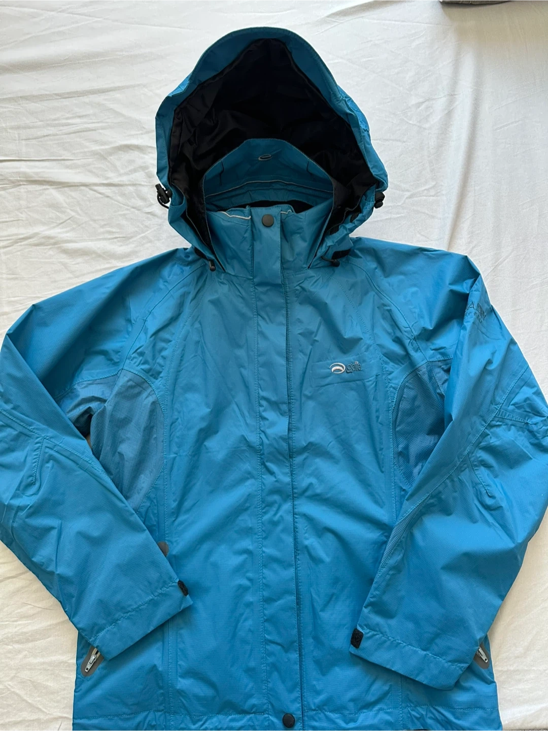 Brand new Craghoppers Gaia Aquadry waterproof jacket in blue colour with hood. It's a size UK 10 or EUR 36. Features multiple pockets inside and out, and adjustable cuffs. This jacket's designed for wet weather conditions!