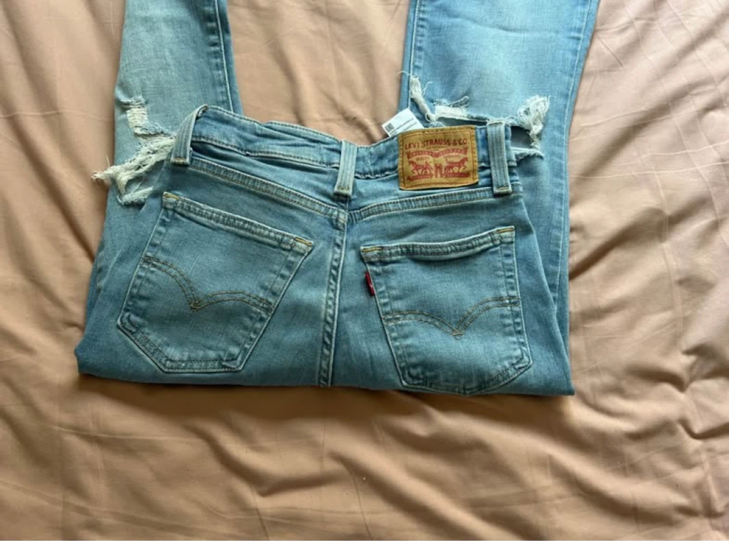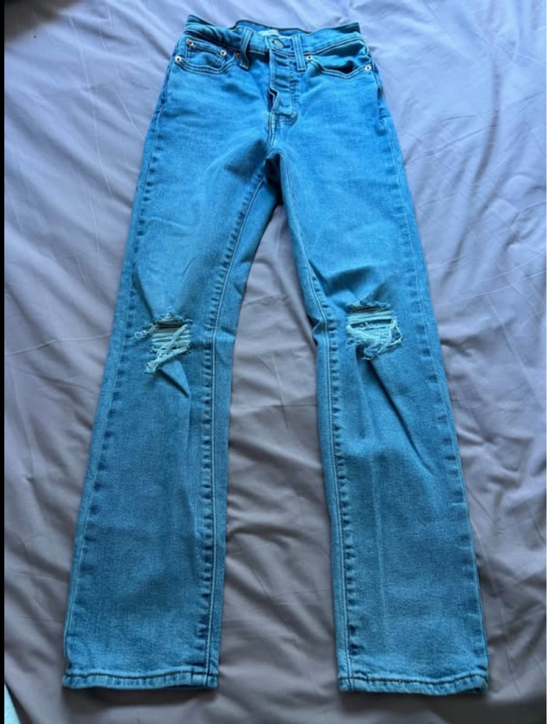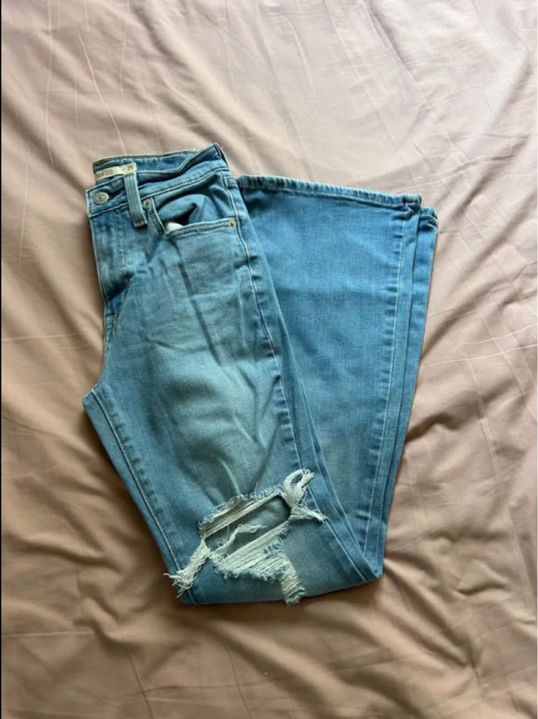 These are light wash Levi's 726 flare jeans. They have distressed ripped details on the knees. Size 25. Perfect for a casual, stylish look! And a good option for Stampede!