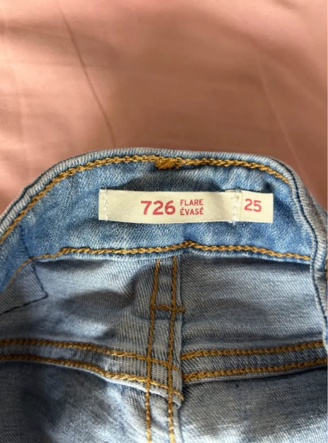 These are light wash Levi's 726 flare jeans. They have distressed ripped details on the knees. Size 25. Perfect for a casual, stylish look! And a good option for Stampede!