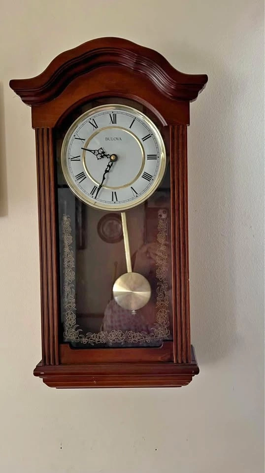 Works great. Chimes on the hour; chime can be turned off. Runs on batteries. This is a beautiful Bulova pendulum wall clock with a wooden frame and glass front. The clock face features Roman numerals and has a gold tone finish. Pick up in Athlone. Cash only.
