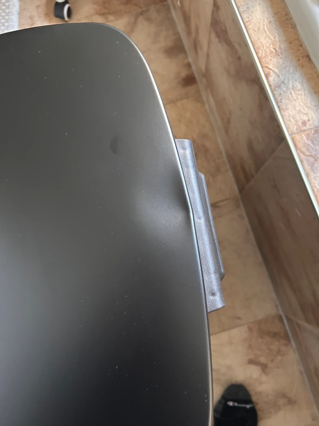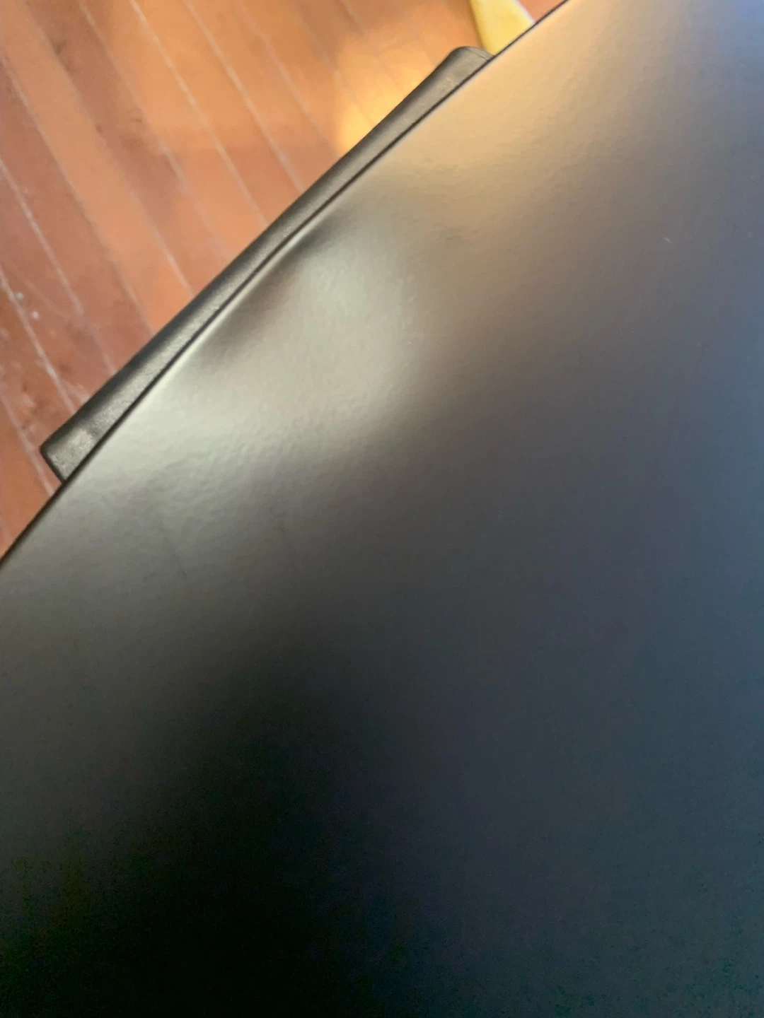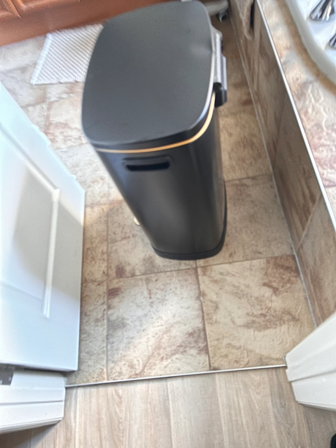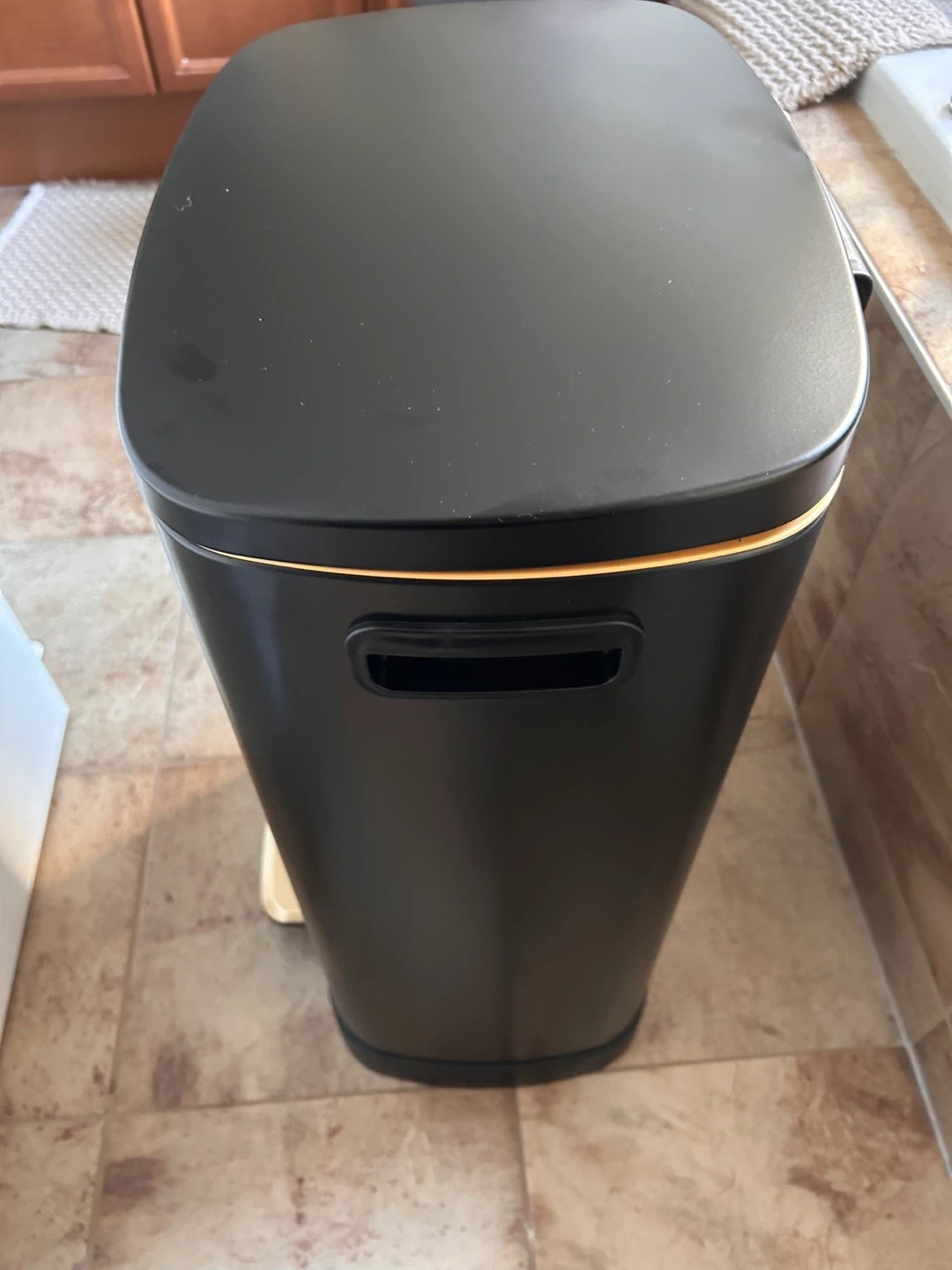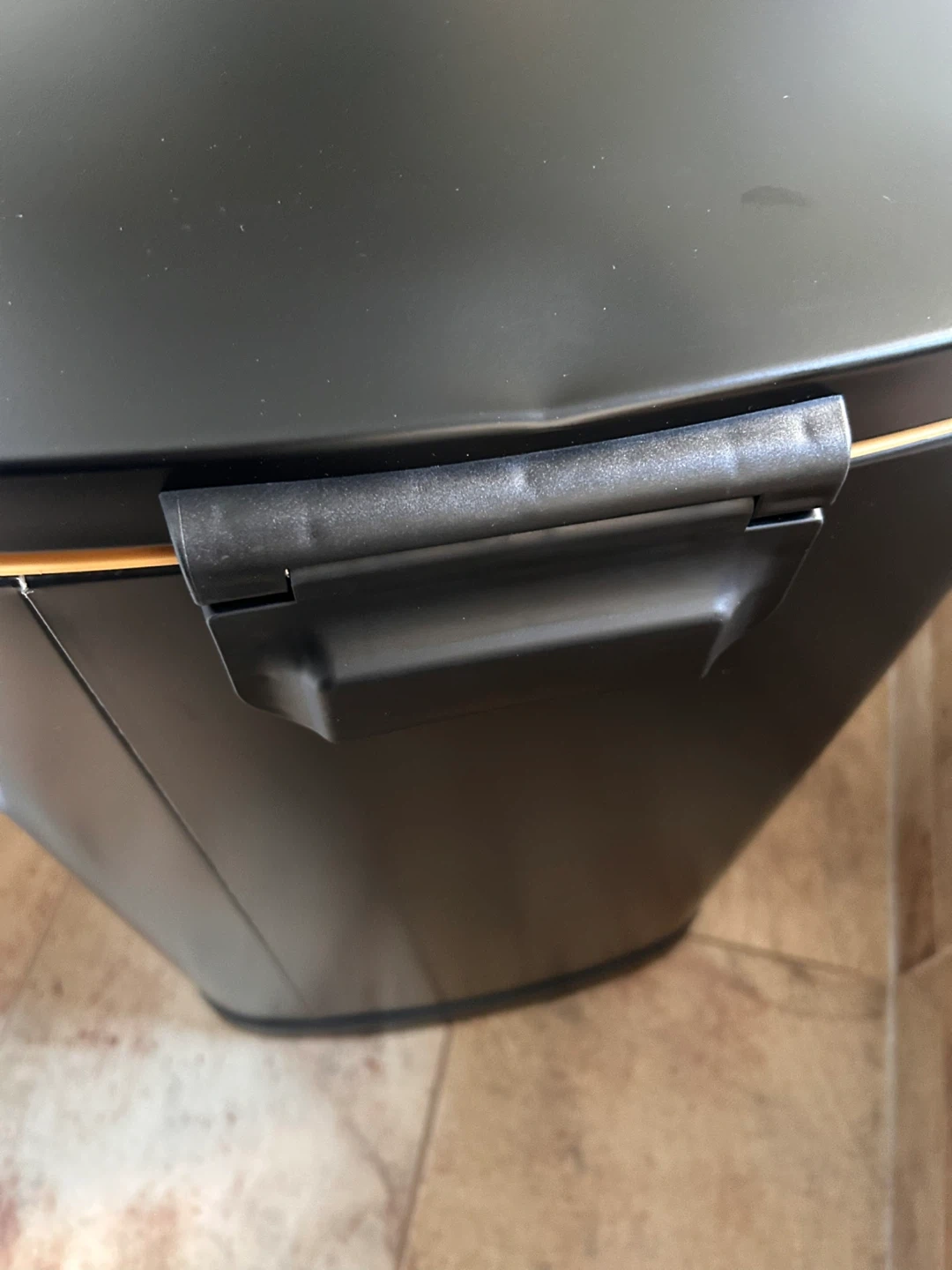 This is a black slim step trash can. It has a soft-close lid and a handle for easy transport. The slim design fits well in tight spaces. It's brand new from Wayfair - retails $139.99 - 13 gallon or 50 litres . It has a small dent as shown on pictures & price reflects.
