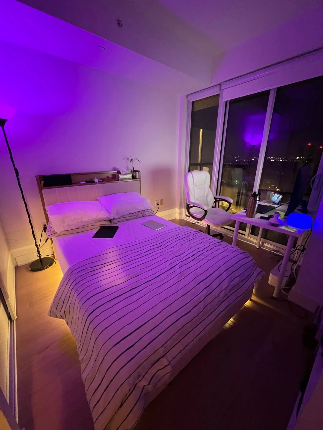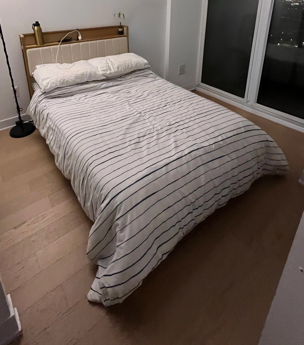 This is a double-sided bed frame. It features a upholstered headboard with a golden accent. The frame includes slats for mattress support, motion sensing lights 2, integrated foot drawers, charging outlet, shelf, with an ivory vertical channel tufting.