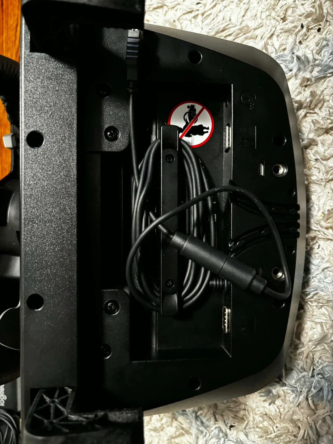 Logitech G920 racing wheel and pedals set. Features a leather-wrapped steering wheel and realistic pedals for an immersive driving experience. Includes power adapter and USB cable.