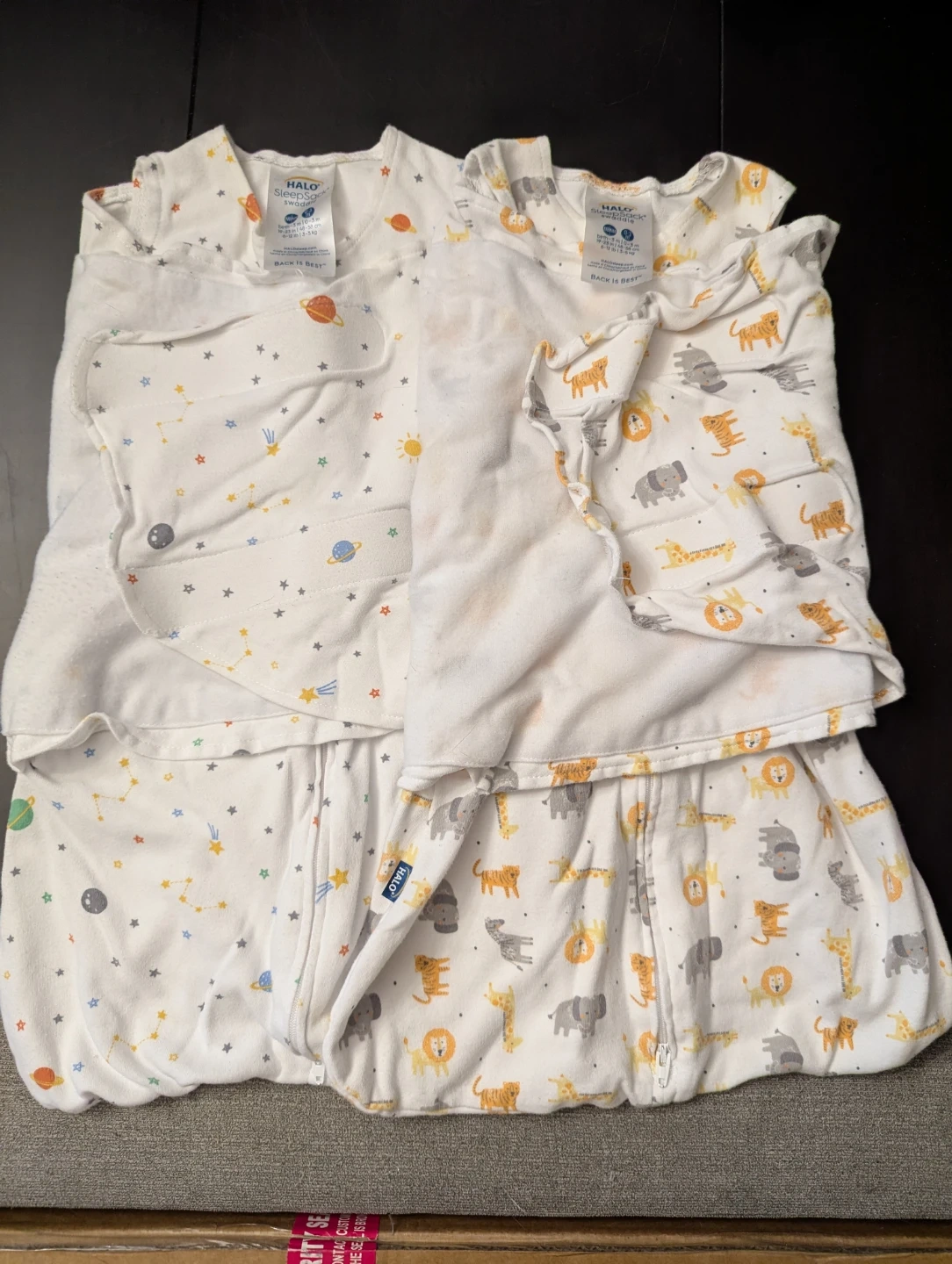 Two HALO Sleepsack swaddles in size newborn. One features a celestial print with planets and stars, and the other has an animal print with lions, tigers, and elephants. Both are white with colorful graphics. They're designed to help babies sleep soundly. These are great for newborns to help them feel secure.