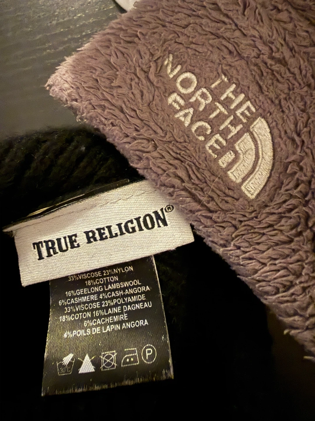 Two beanies included: one fuzzy grey beanie from The North Face and one black knit beanie from True Religion. Materials for the True Religion beanie are 33% Viscose, 18% Cotton, 6% Geel, 16% Lambswool, 4% Cashmere-Angora, 33% Viscose, 23% Polyamide. This set is great for keeping warm!