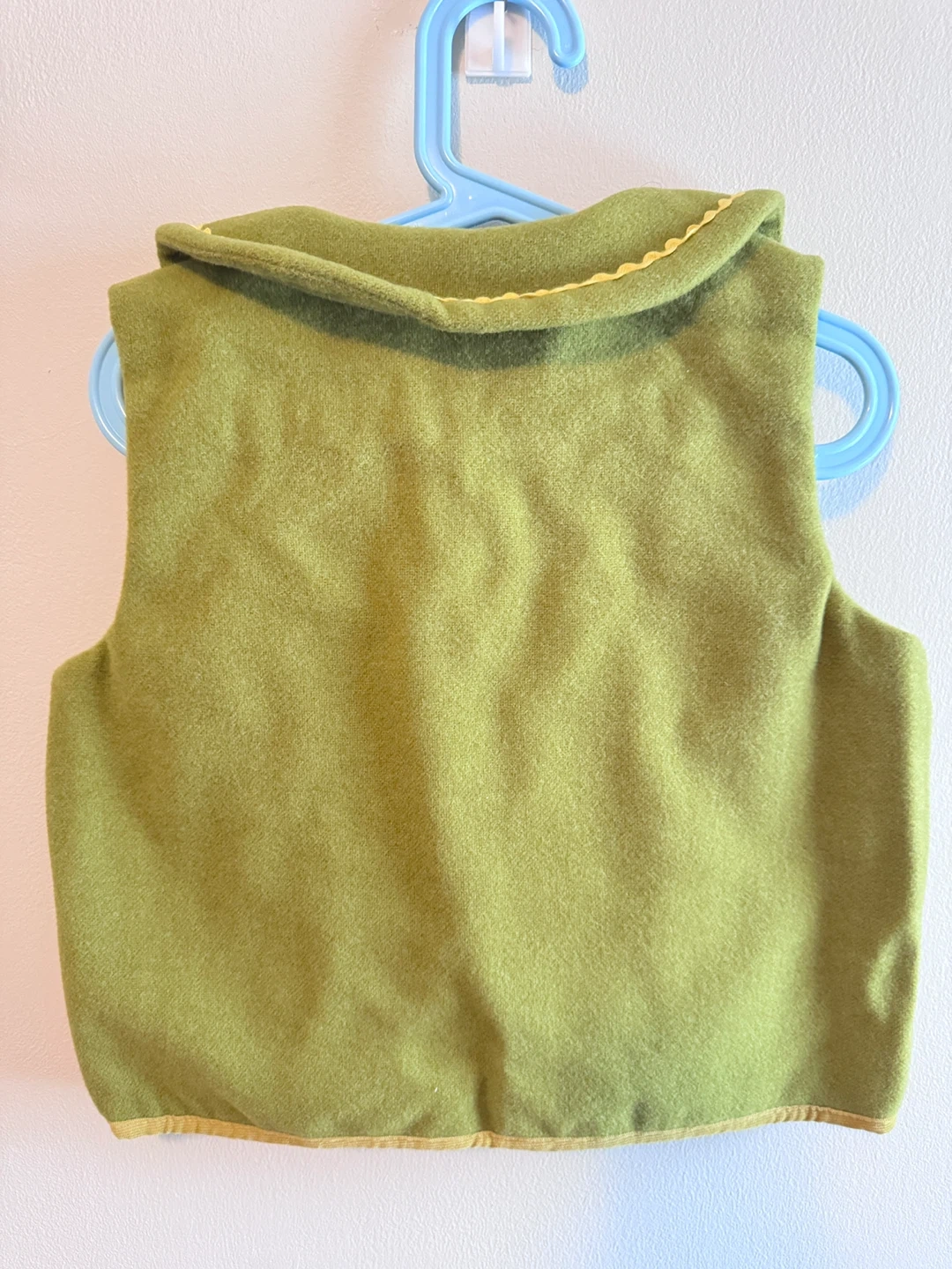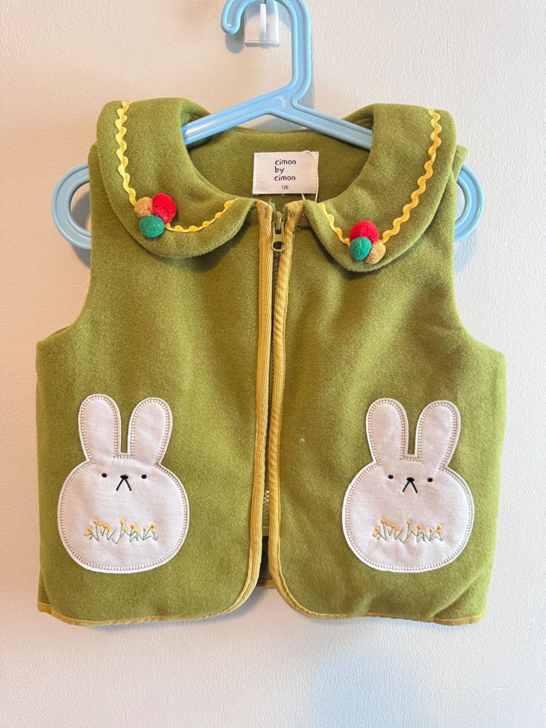 This adorable green quilted set features cute bunny appliques on the front. It's lined for extra warmth! The front has a zipper closure and decorative yellow trim. Perfect for layering on cooler days.