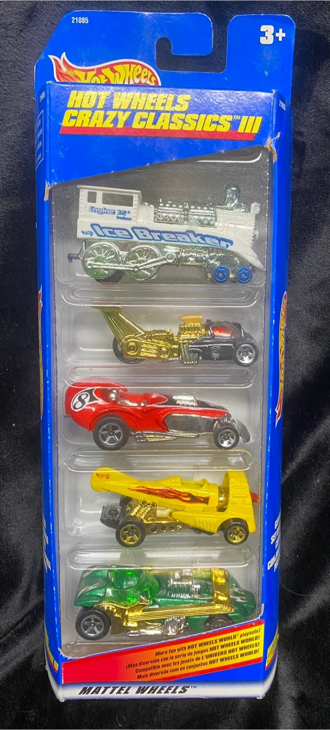 Relive the nostalgia with this vintage, new-in-box Hot Wheels Crazy Classics III set featuring five unique and collectible die-cast cars. This set is a treasure for Hot Wheels enthusiasts and collectors alike!