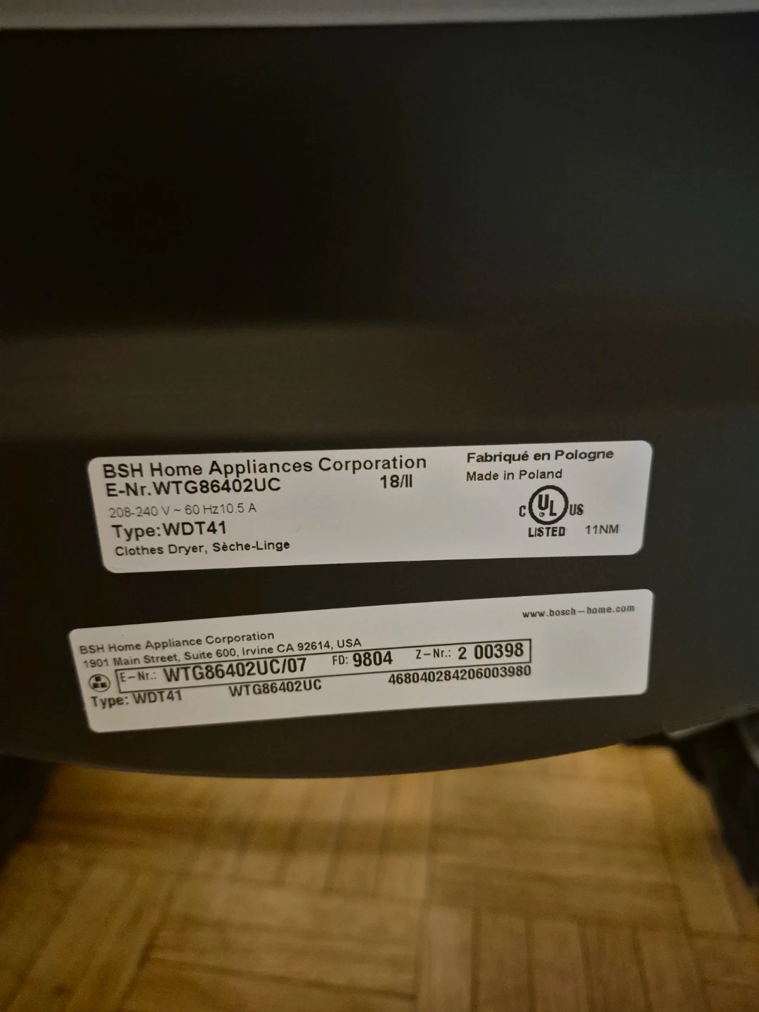 Bosch 800 Series clothes dryer, model WTG86402UC. This dryer features various cycles including Cotton Dry, Anti Shrink, Sanitize, and Quick Dry Auto. It's designed for efficient drying of laundry. Made in Poland.