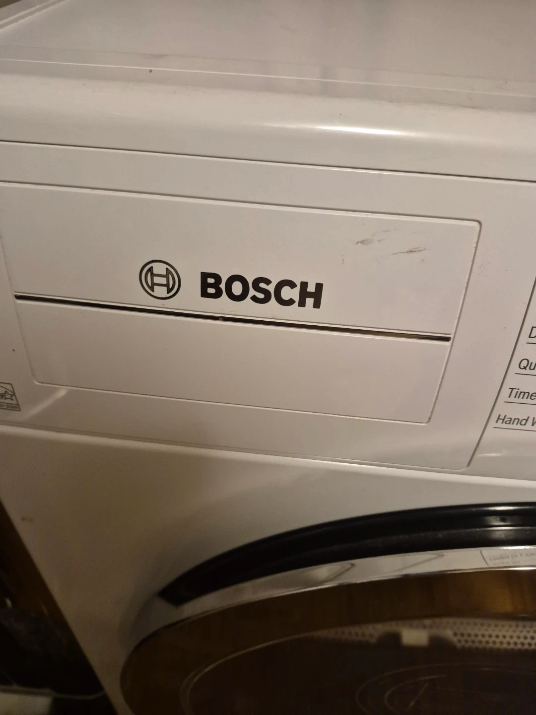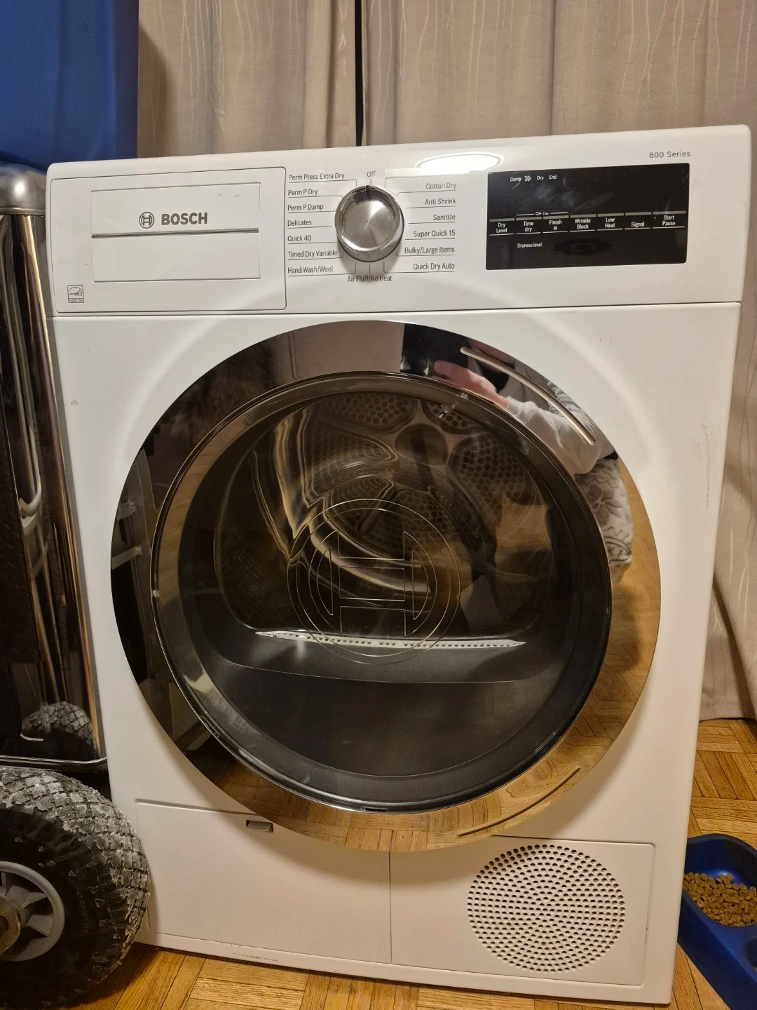 Bosch 800 Series clothes dryer, model WTG86402UC. This dryer features various cycles including Cotton Dry, Anti Shrink, Sanitize, and Quick Dry Auto. It's designed for efficient drying of laundry. Made in Poland.