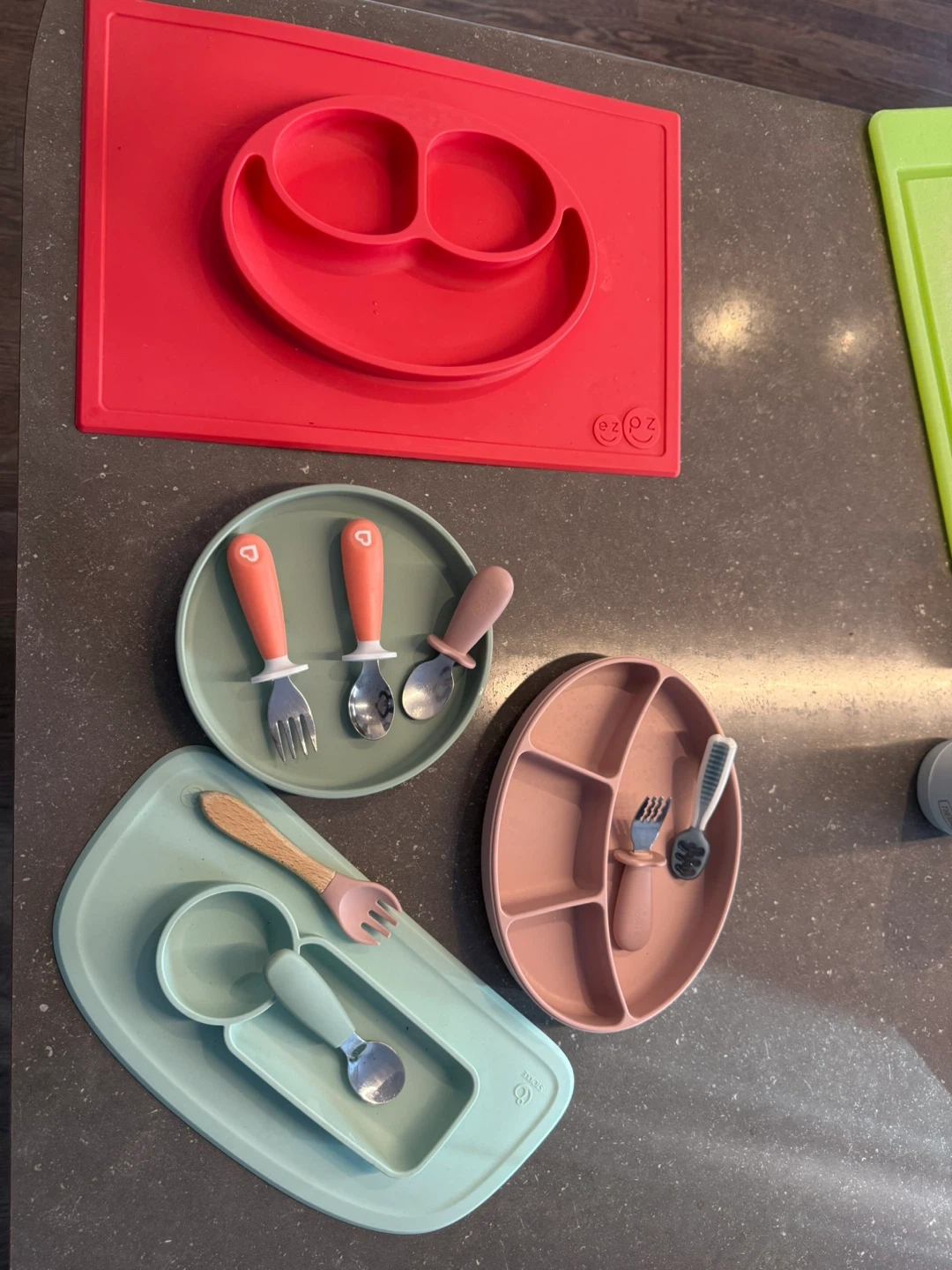 This set includes EZPZ silicone suction plates and utensils. It features divided plates to help with portion control. Made from BPA-free silicone, it's durable and easy to clean.