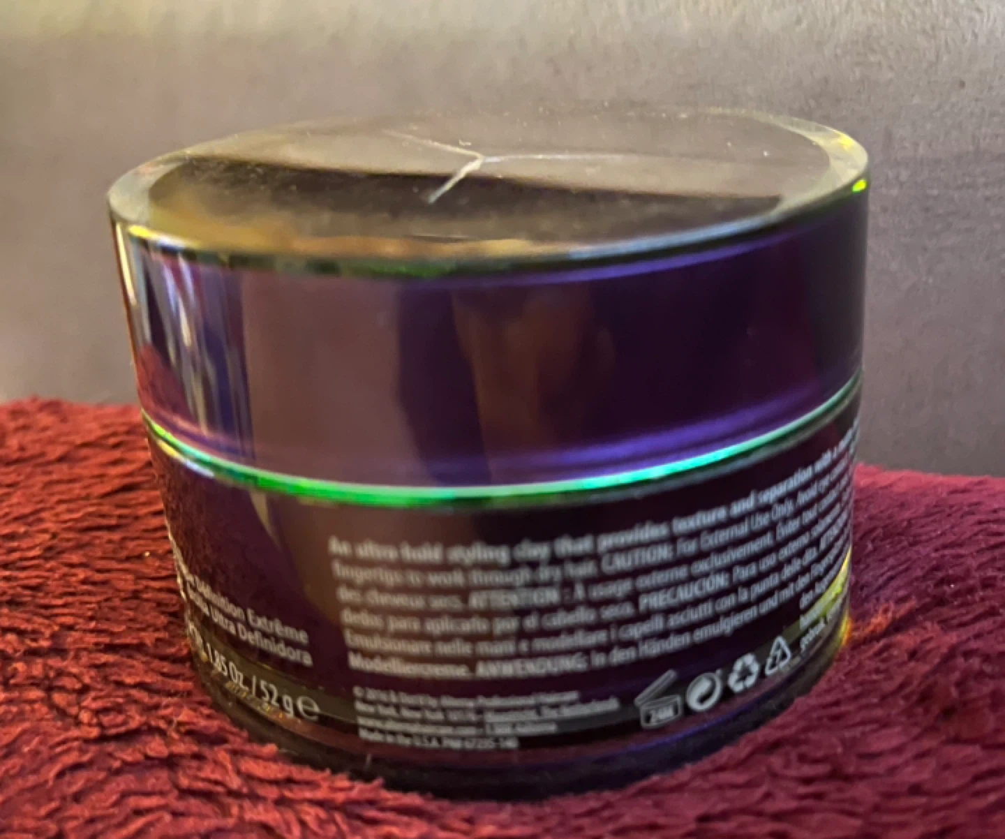 This is an ultra-fluid styling clay that provides texture and separation. It's designed for extreme hold and definition. The clay is 1.65 oz / 52 g.