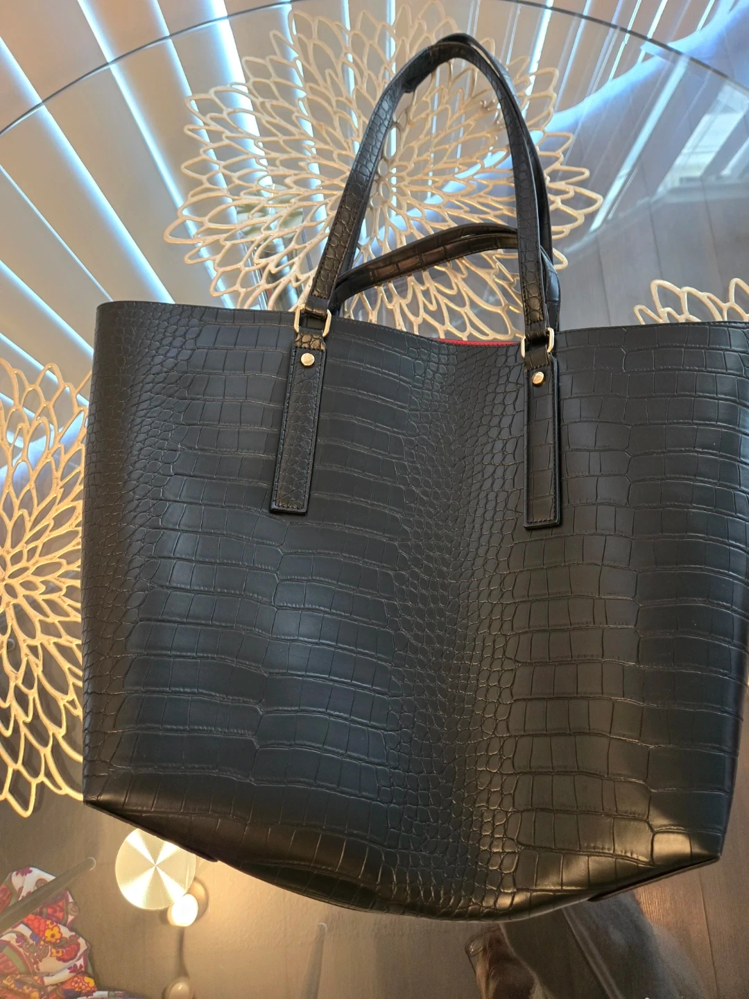 Stylish black tote bag with a croc embossed exterior. It features a bright red interior lining. This spacious bag is perfect for everyday use. From Aldo, never worn.