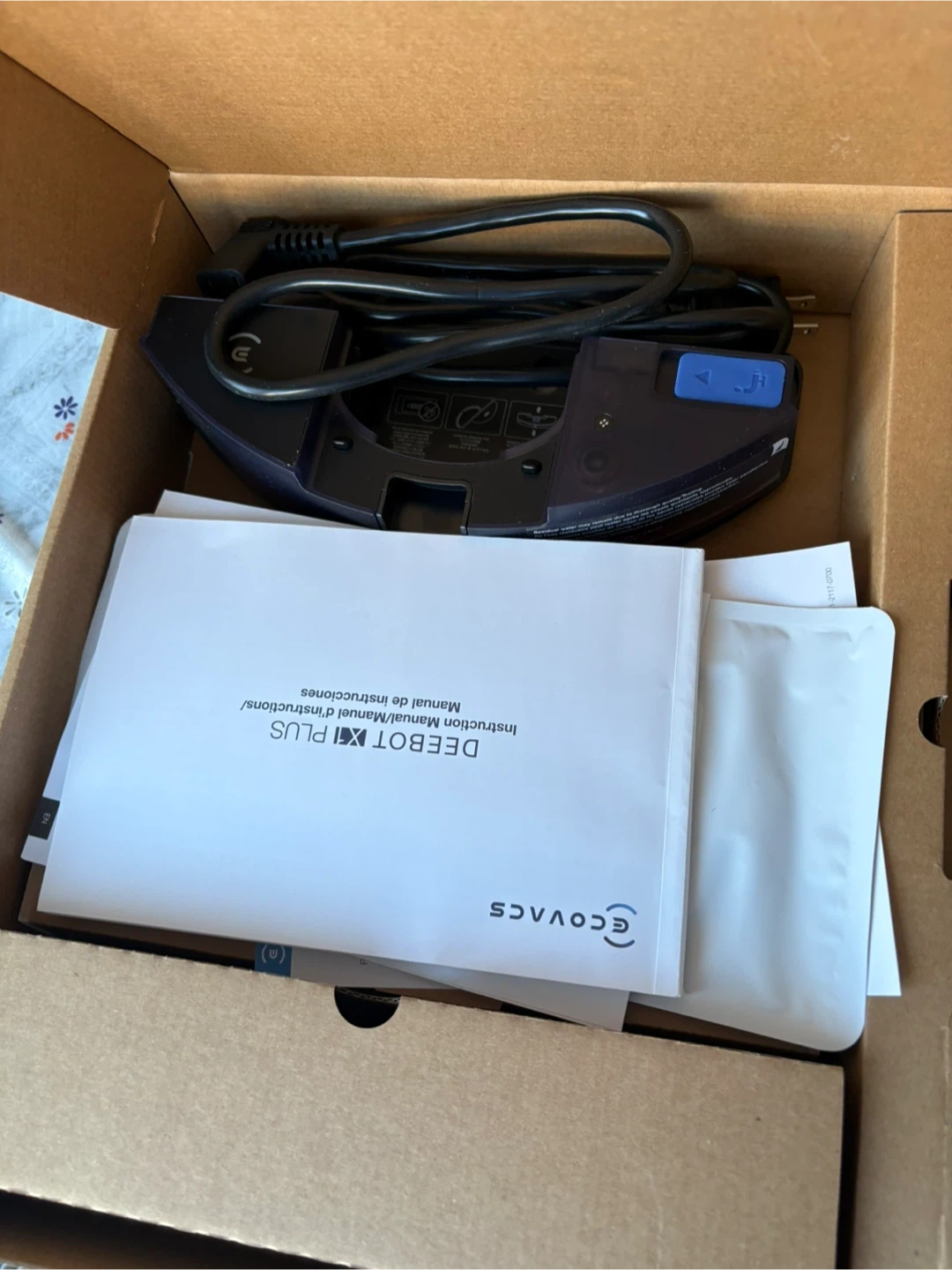 Box includes: Robot, charging/docking station, power cables, manuals.