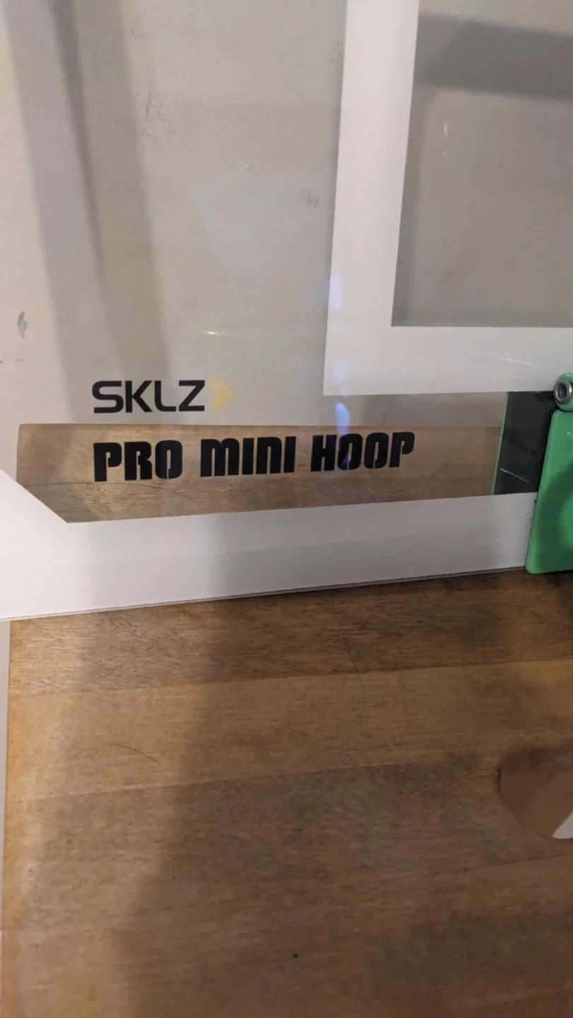 This is a SKLZ Pro Mini Hoop basketball set. It's a clear backboard with a green breakaway rim and net. It's sized for mini basketballs.