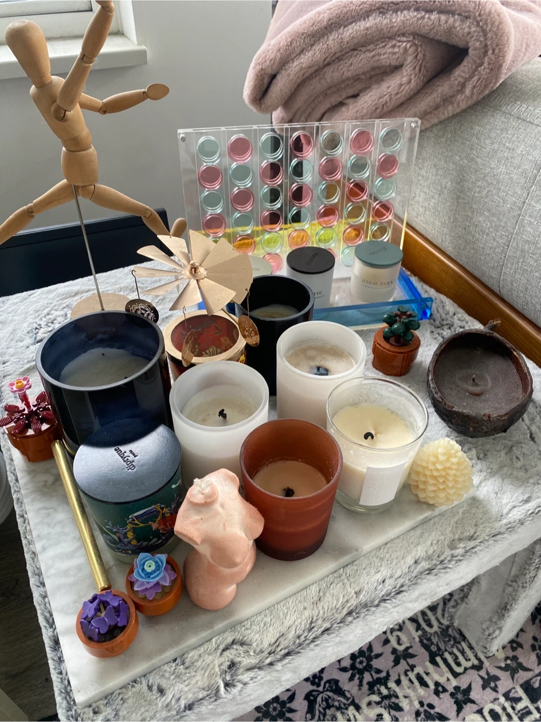 Selling everything on this table including this handmade fur table. IKEA wooden man - free Candle - large $5 each Small - free Legos - $5 each Table - $10