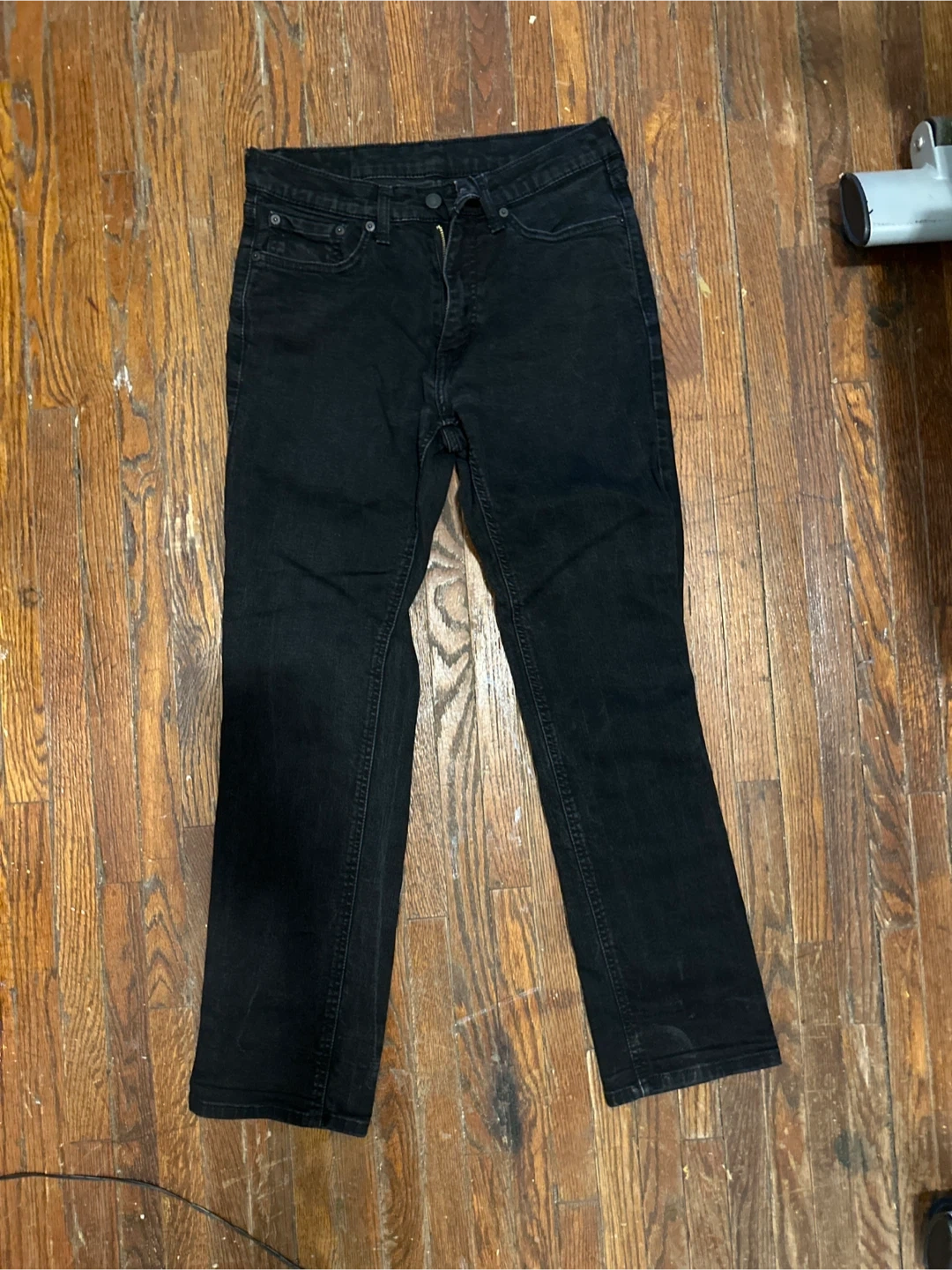 Classic black Levi's denim jeans. These are a stylish and durable choice for everyday wear. They feature a comfortable fit and are made from high-quality denim.
