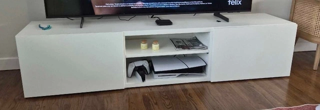 This modern white TV stand offers a sleek and minimalist design, perfect for any living room setup. It provides ample storage with both open shelving and closed compartments.