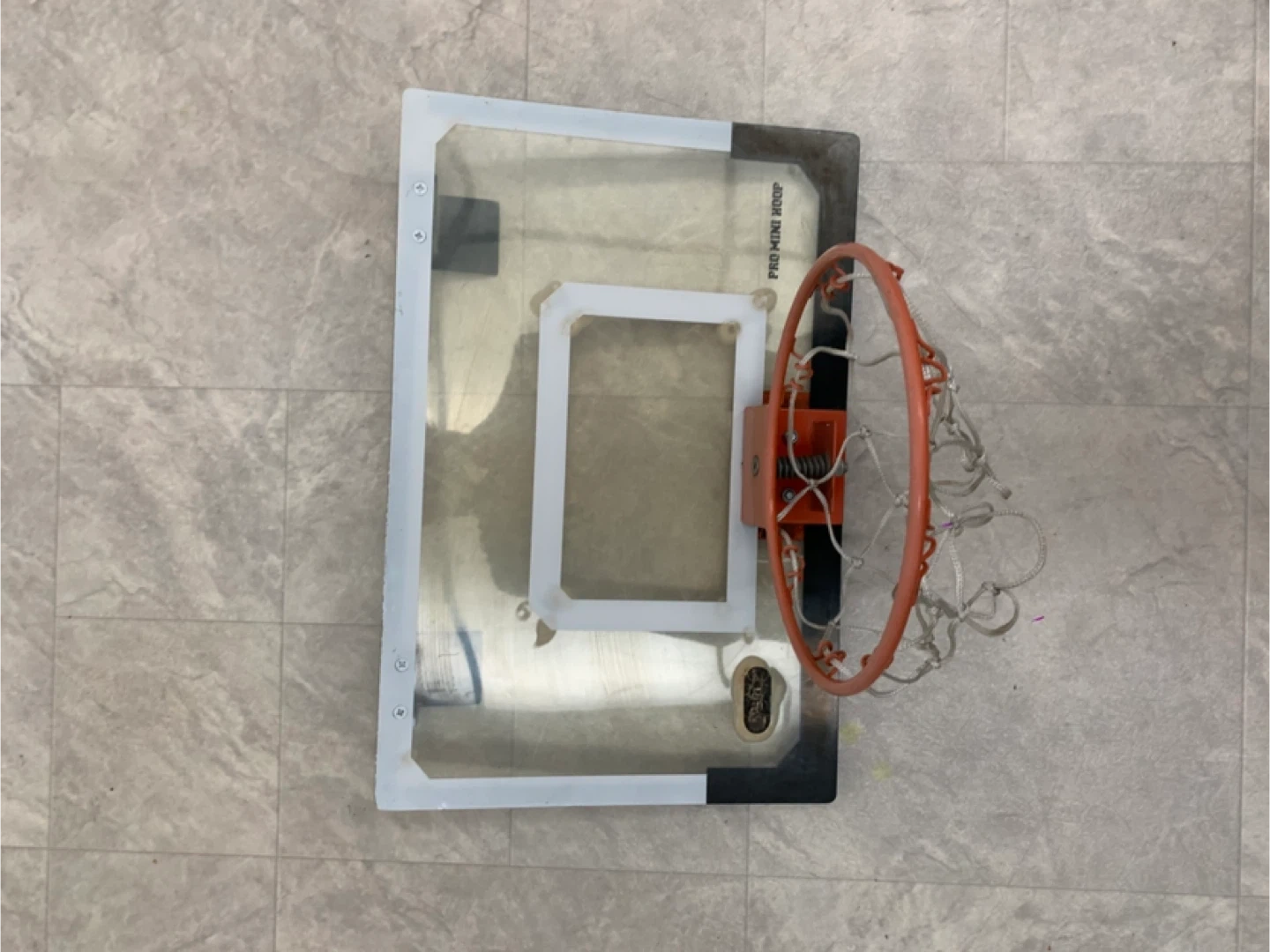 This is a Pro Mini Hoop basketball set. It includes a backboard, an orange rim with a net, and mounting hardware. This hoop is great for some indoor fun!