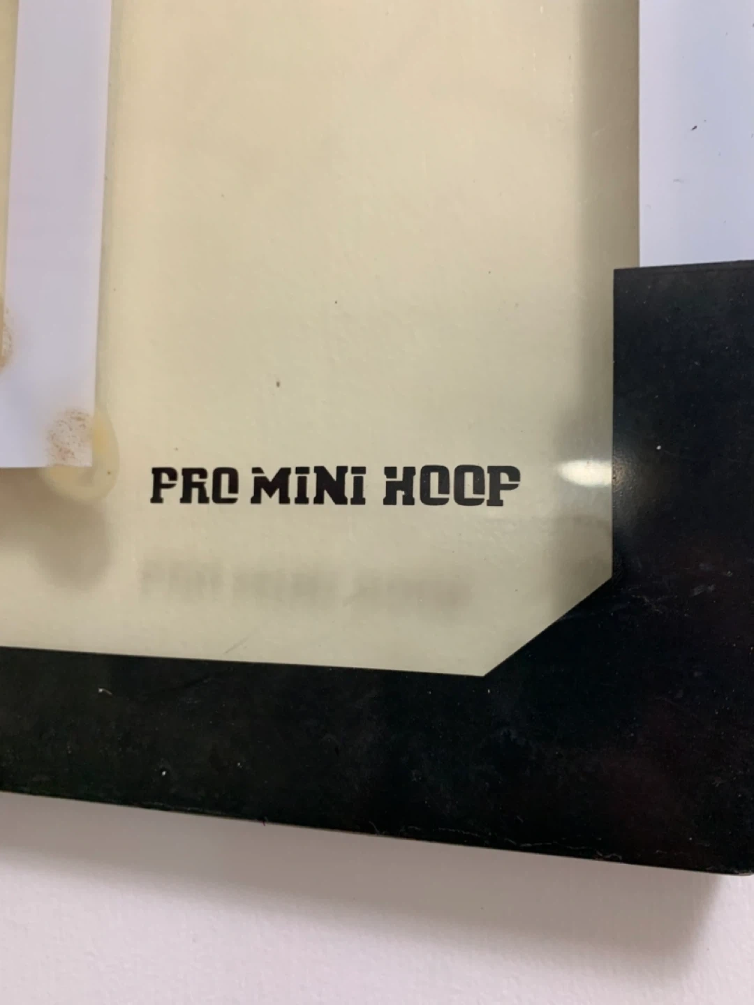 This is a Pro Mini Hoop basketball set. It includes a backboard, an orange rim with a net, and mounting hardware. This hoop is great for some indoor fun!